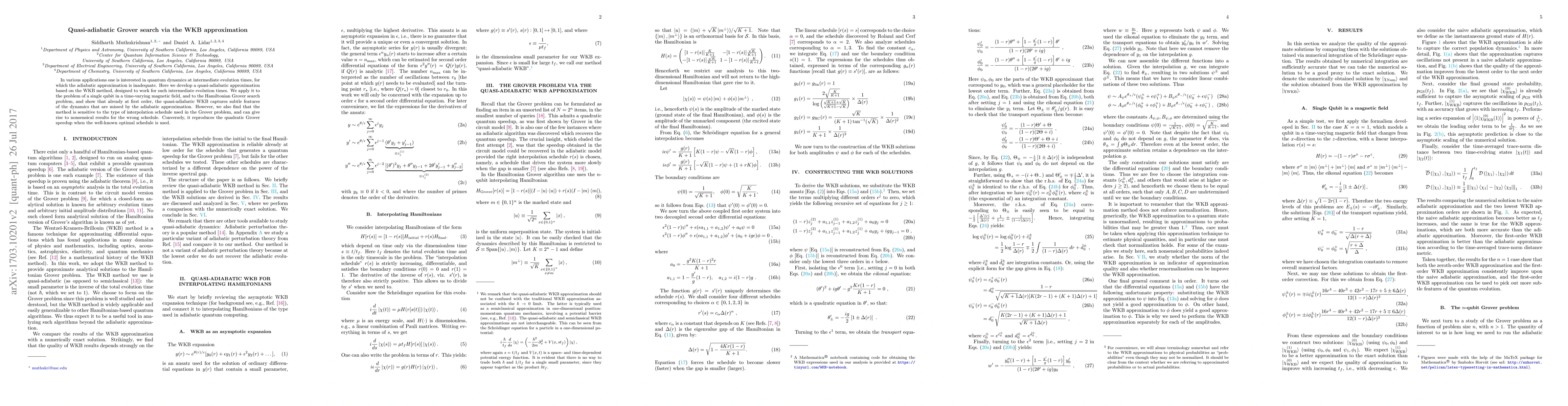 This paper develops a quasi-adiabatic approximation using the WKB method for quantum dynamics at intermediate evolution times, applying it to Grover search and showing it captures dynamics missed by the adiabatic approximation. However, the method's accuracy depends on the interpolation schedule used, failing for incorrect schedules due to normalization loss but reproducing the quadratic speedup with the optimal schedule.