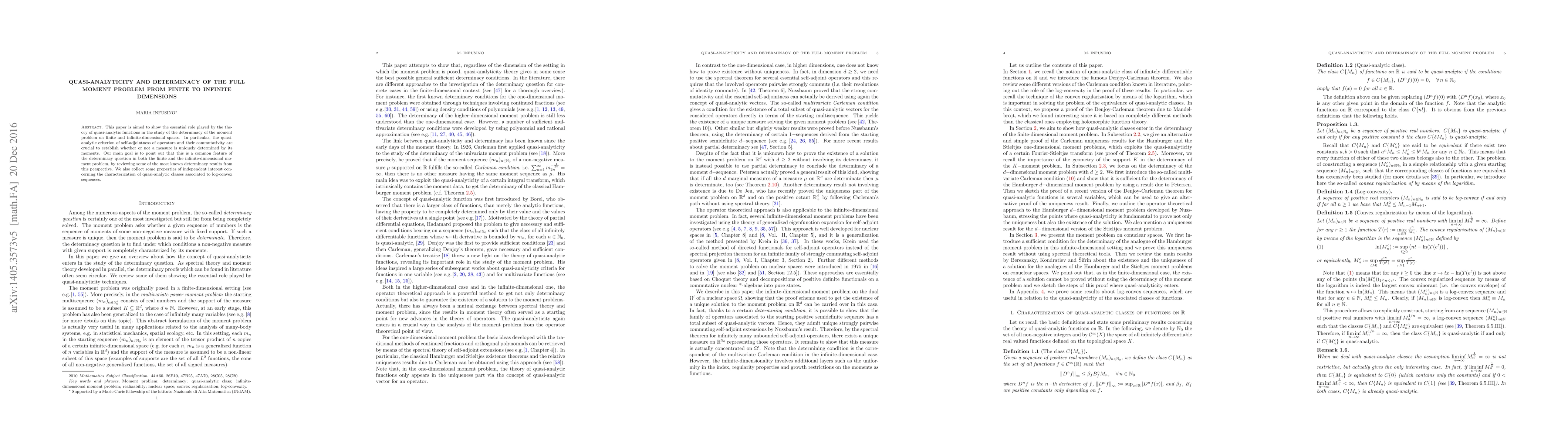 This paper is aimed to show the essential role played by the theory of quasi-analytic functions in the study of the determinacy of the moment problem on finite and infinite-dimensional spaces. In particular, the quasi-analytic criterion of self-adjointness of operators and their commutativity are crucial to establish whether or not a measure is uniquely determined by its moments. Our main goal is to point out that this is a common feature of the determinacy question in both the finite and the infinite-dimensional moment problem, by reviewing some of the most known determinacy results from this perspective. We also collect some properties of independent interest concerning the characterization of quasi-analytic classes associated to log-convex sequences.