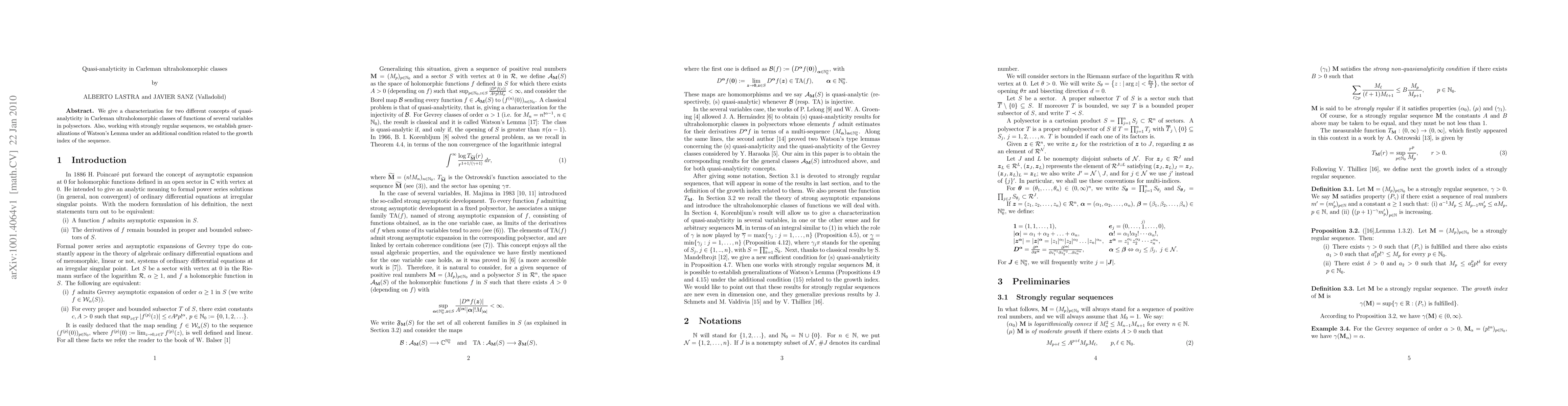 This paper characterizes quasi-analyticity in Carleman ultraholomorphic classes for functions of several variables, and extends Watson's Lemma using strongly regular sequences with a condition tied to the growth index of the sequence.