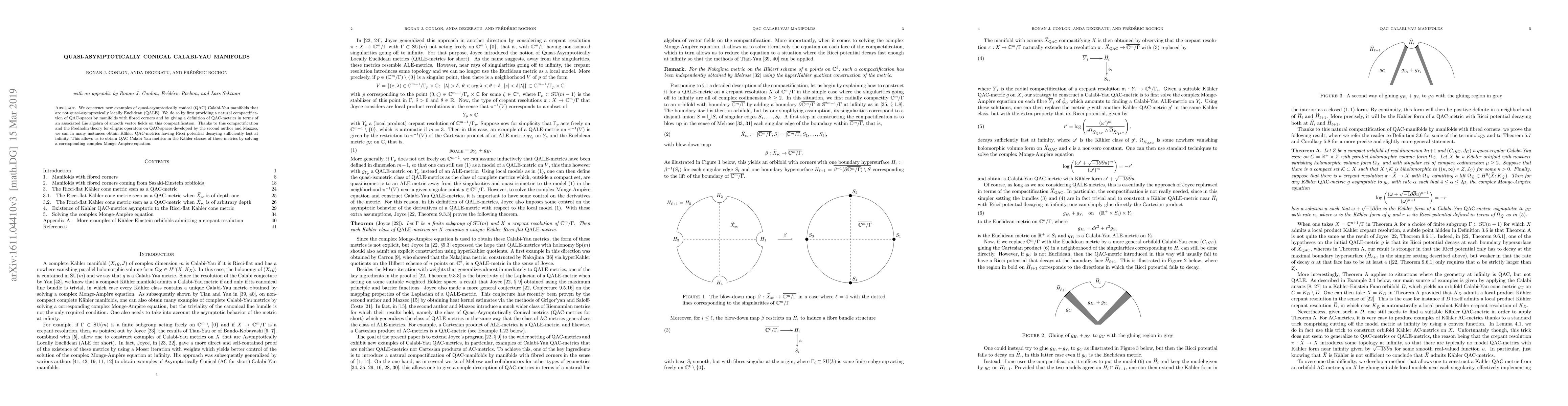 The paper constructs new quasi-asymptotically conical (QAC) Calabi-Yau manifolds that diverge from quasi-asymptotically locally Euclidean (QALE) structures. It achieves this through compactification of QAC-spaces and definition of QAC-metrics, enabling the derivation of Kähler QAC-metrics and resolution of complex Monge-Ampère equations for QAC Calabi-Yau metrics.