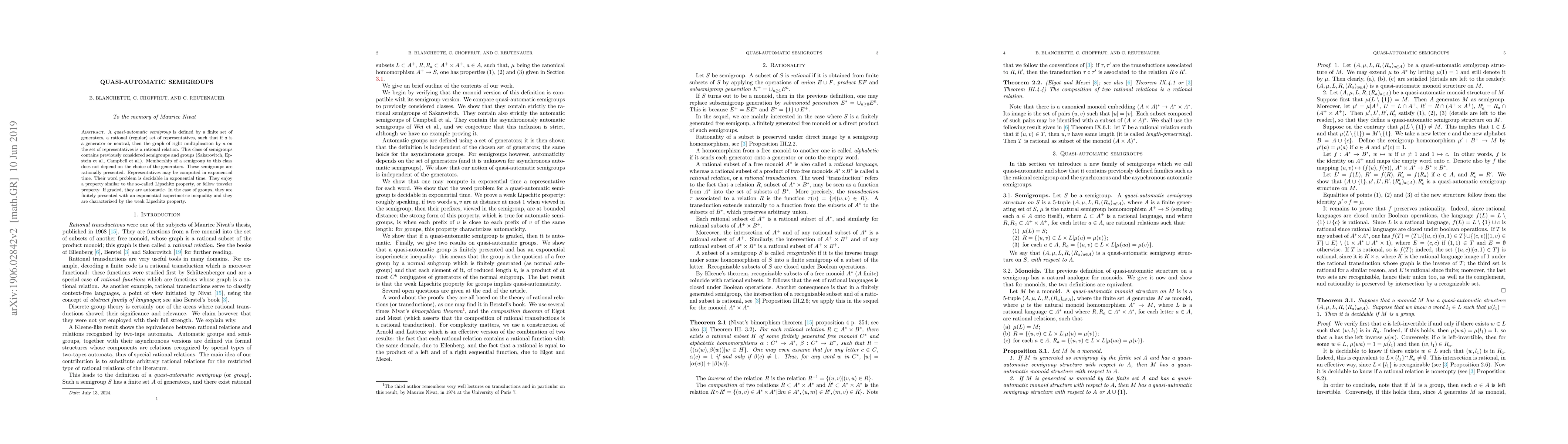 Quasi-automatic semigroups are rationally presented and defined by a finite set of generators and rational representatives, with their word problem decidable in exponential time. These semigroups exhibit a Lipschitz property and are automatic when graded, with groups in this class being finitely presented and characterized by a weak Lipschitz property.