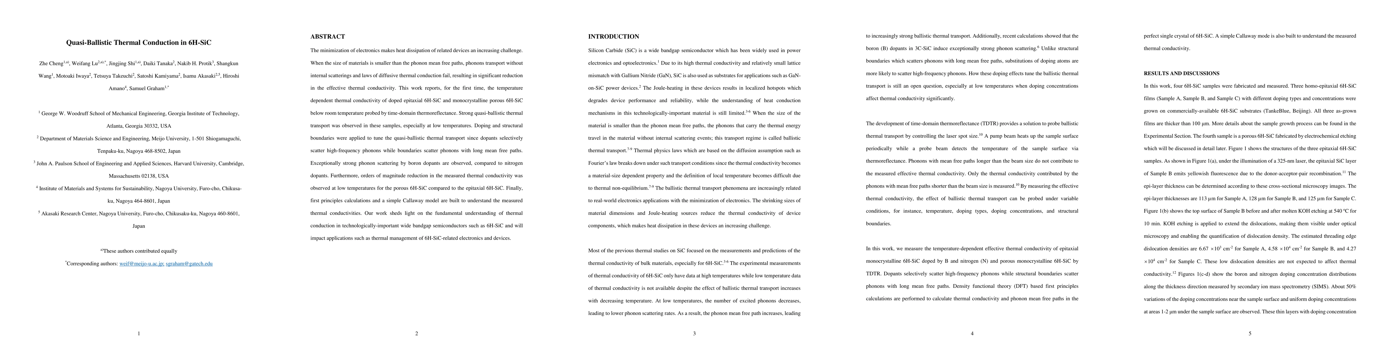 This paper investigates quasi-ballistic thermal conduction in doped and porous 6H-SiC, finding significant reductions in thermal conductivity at low temperatures due to phonon scattering. It highlights boron dopants' superior scattering effect compared to nitrogen dopants, offering insights for thermal management in 6H-SiC electronics.