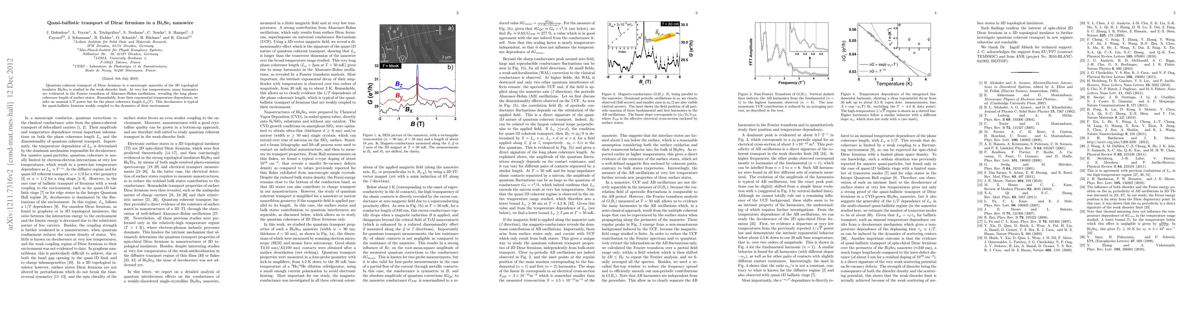 Quantum coherent transport of Dirac fermions in a mesoscopic nanowire of the 3D topological insulator Bi2Se3 is studied in the weak-disorder limit. At very low temperatures, many harmonics are evidenced in the Fourier transform of Aharonov-Bohm oscillations, revealing the long phase-coherence length of surface states. Remarkably, from their exponential temperature dependence, we infer an unusual 1/T power law for the phase coherence length. This decoherence is typical for quasi-ballistic fermions weakly coupled to the dynamics of their environment.