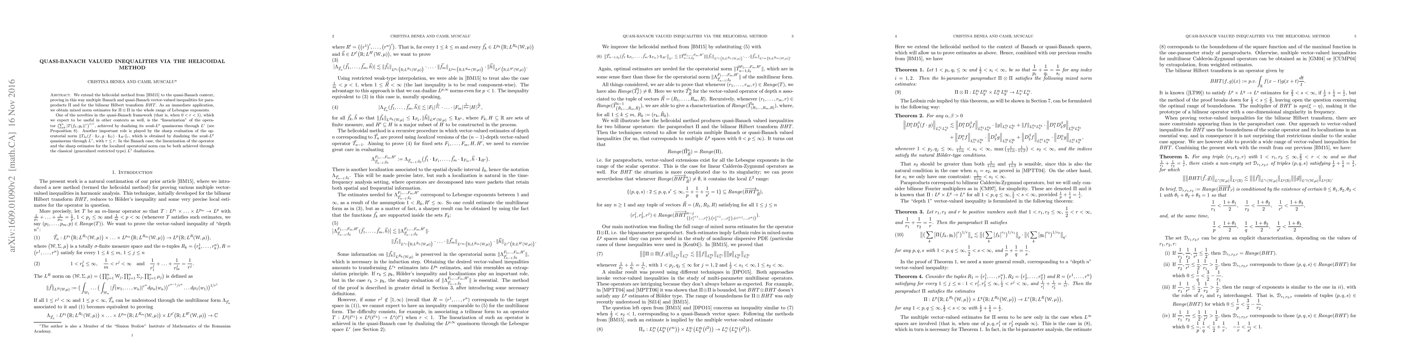 This paper extends the helicoidal method to quasi-Banach spaces, proving vector-valued inequalities for paraproducts and the bilinear Hilbert transform, and obtaining mixed norm estimates for $\Pi \otimes \Pi$. It introduces a "linearization" technique for operators in quasi-Banach frameworks and provides sharp estimates for localized operatorial norms.