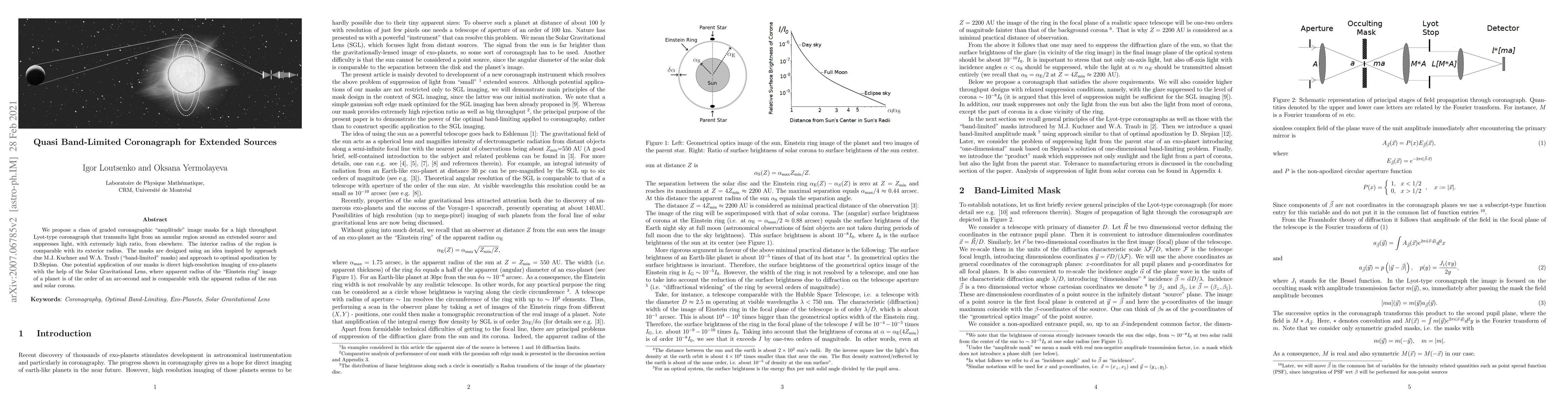 We propose a class of graded coronagraphic "amplitude" image masks for a high throughput Lyot-type coronagraph that transmits light from an annular region around an extended source and suppresses light, with extremely high ratio, from elsewhere. The interior radius of the region is comparable with its exterior radius. The masks are designed using an idea inspired by approach due M.J. Kuchner and W.A. Traub ("band-limited" masks) and approach to optimal apodization by D.Slepian. One potential application of our masks is direct high-resolution imaging of exo-planets with the help of the Solar Gravitational Lens, where apparent radius of the "Einstein ring" image of a planet is of the order of an arc-second and is comparable with the apparent radius of the sun and solar corona. Keywords: Coronagraphy, Optimal Band-Limiting, Exo-Planets, Solar Gravitational Lens