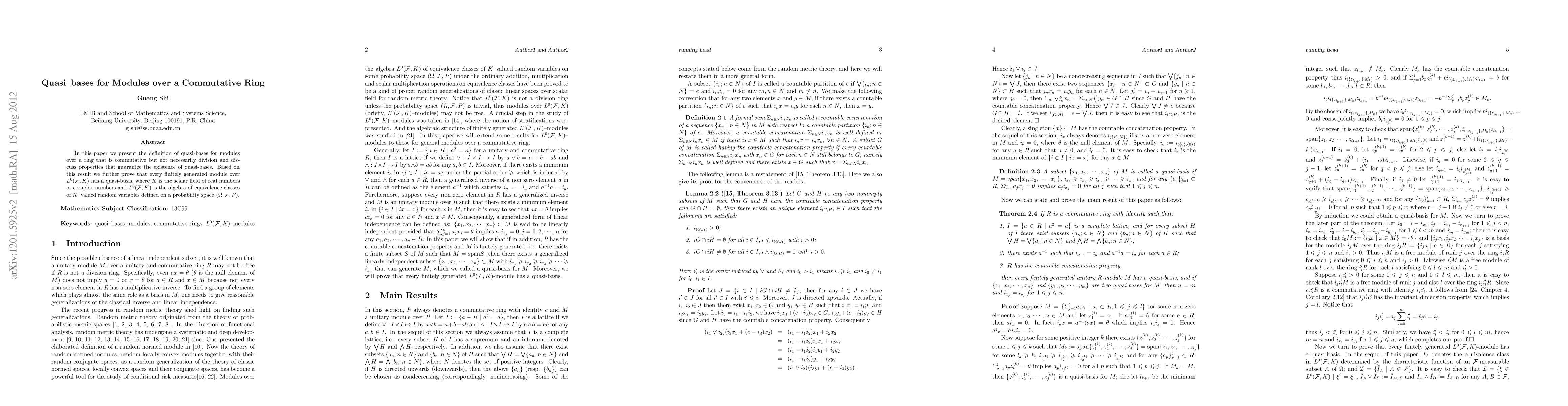 In this paper we present the definition of quasi-bases for modules over a ring that is commutative but not necessarily division and discuss properties that guarantee the existence of quasi-bases. Based on this result we further prove that every finitely generated module over $L^{0}(\mathcal{F},K)$ has a quasi-basis, where $K$ is the scalar field of real numbers or complex numbers and $L^{0}(\mathcal{F},K)$ is the algebra of equivalence classes of $K$--valued random variables defined on a probability space $(\Omega,\mathcal{F},P)$.