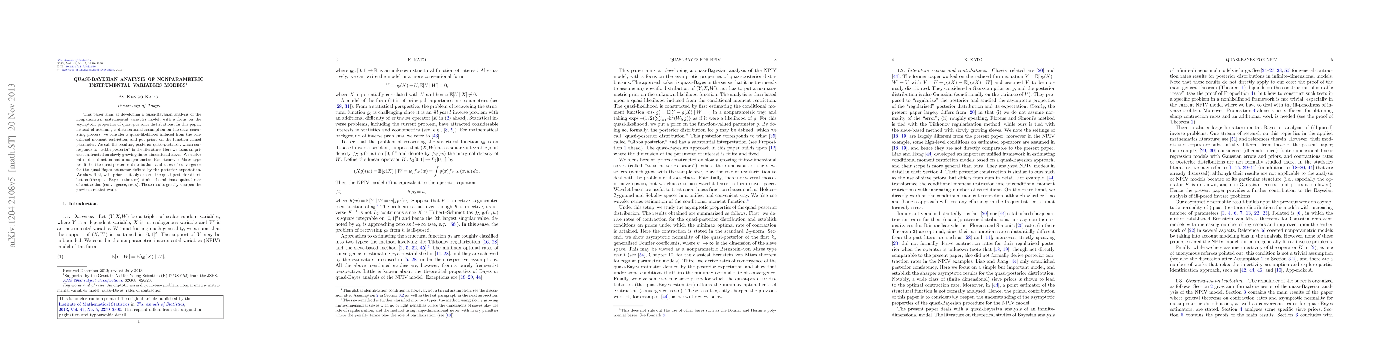 This paper develops a quasi-Bayesian analysis for nonparametric instrumental variable models, focusing on the asymptotic properties of quasi-posterior distributions. It achieves this without distributional assumptions, instead using quasi-likelihood and function-valued parameter priors, and shows optimal contraction and convergence rates for the quasi-Bayes estimator.