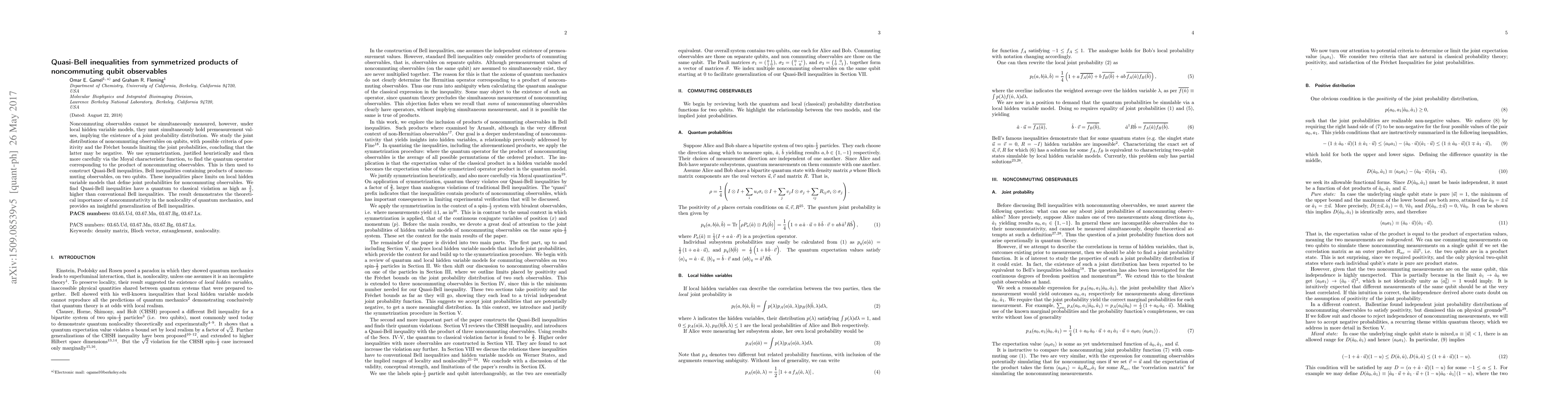 Noncommuting observables cannot be simultaneously measured, however, under local hidden variable models, they must simultaneously hold premeasurement values, implying the existence of a joint probability distribution. We study the joint distributions of noncommuting observables on qubits, with possible criteria of positivity and the Fr\'echet bounds limiting the joint probabilities, concluding that the latter may be negative. We use symmetrization, justified heuristically and then more carefully via the Moyal characteristic function, to find the quantum operator corresponding to the product of noncommuting observables. This is then used to construct Quasi-Bell inequalities, Bell inequalities containing products of noncommuting observables, on two qubits. These inequalities place limits on local hidden variable models that define joint probabilities for noncommuting observables. We find Quasi-Bell inequalities have a quantum to classical violation as high as $\frac{3}{2}$, higher than conventional Bell inequalities. The result demonstrates the theoretical importance of noncommutativity in the nonlocality of quantum mechanics, and provides an insightful generalization of Bell inequalities.