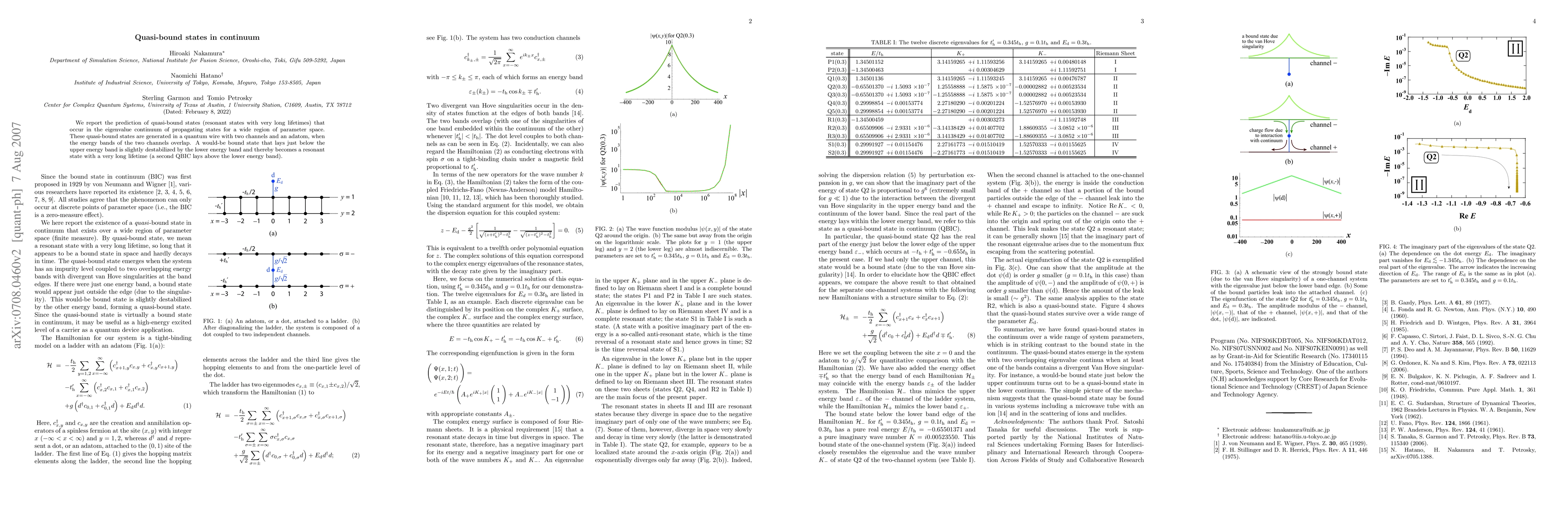This paper predicts quasi-bound states in the continuum of propagating states within a quantum wire with two overlapping energy bands, caused by an adatom. These states, termed quasi-bound, have very long lifetimes due to destabilization by the lower energy band.