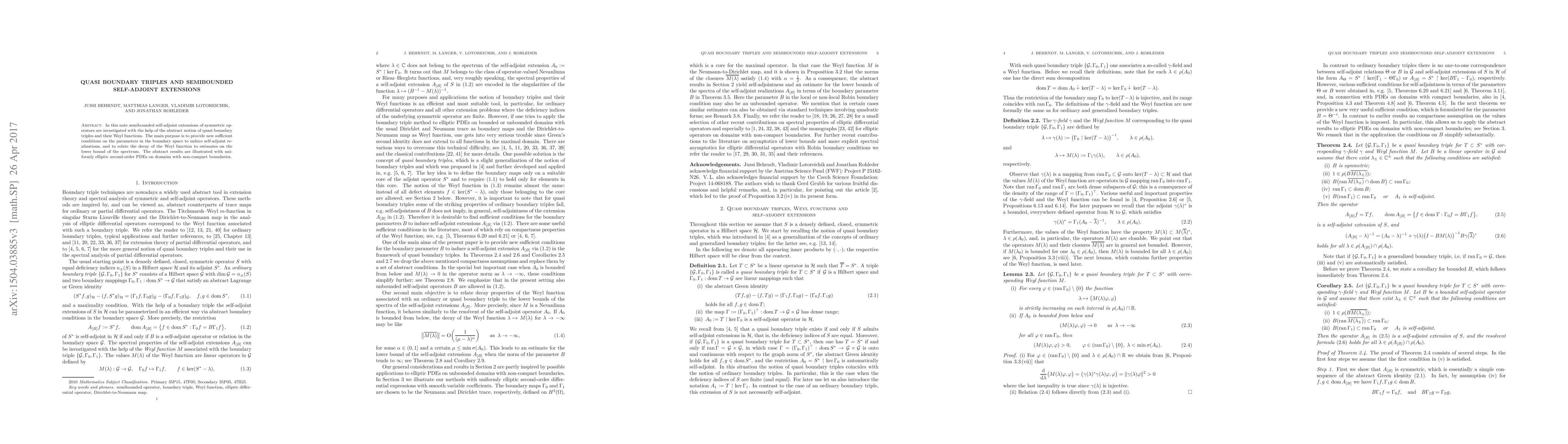 This paper explores semibounded self-adjoint extensions of symmetric operators using quasi boundary triples and their Weyl functions, providing new conditions for self-adjoint realizations and linking the Weyl function's decay to spectral lower bounds. The findings are exemplified through uniformly elliptic second-order PDEs on domains with non-compact boundaries.