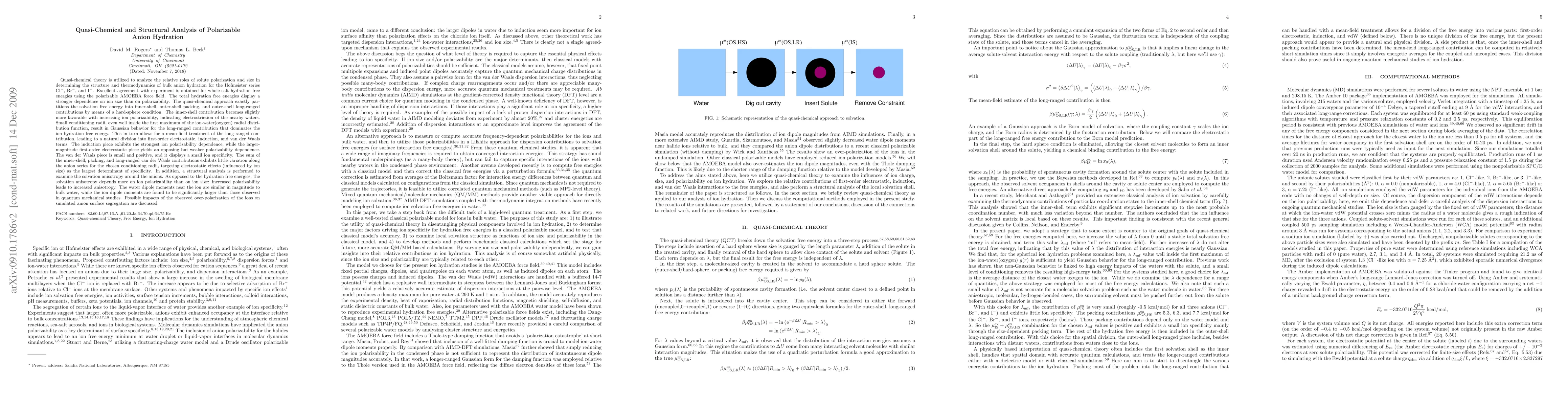 This paper employs quasi-chemical theory and the polarizable AMOEBA force field to analyze the structure and thermodynamics of anion hydration for Cl$^-$, Br$^-$, and I$^-$, showing strong agreement with experimental data. It reveals that ion polarizability, rather than size, predominantly influences solvation anisotropy, with significant implications for simulated anion surface segregation.