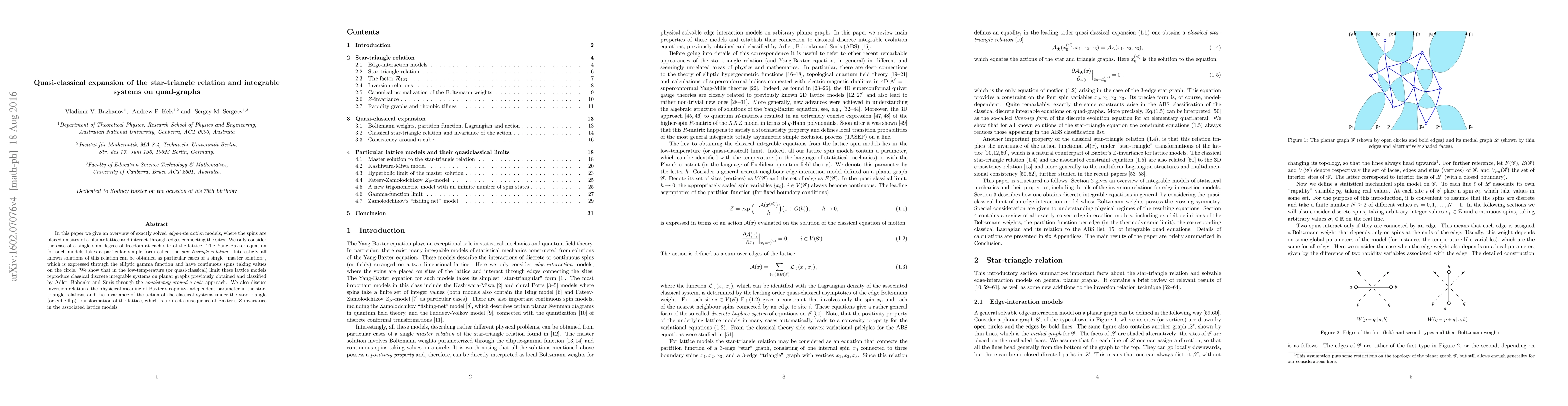 This paper explores exactly solved edge-interaction models on planar lattices, deriving a "master solution" for the star-triangle relation using the elliptic gamma function. It shows that these models reproduce classical integrable systems in the quasi-classical limit, highlighting the invariance under lattice transformations and the physical significance of Baxter's parameter.