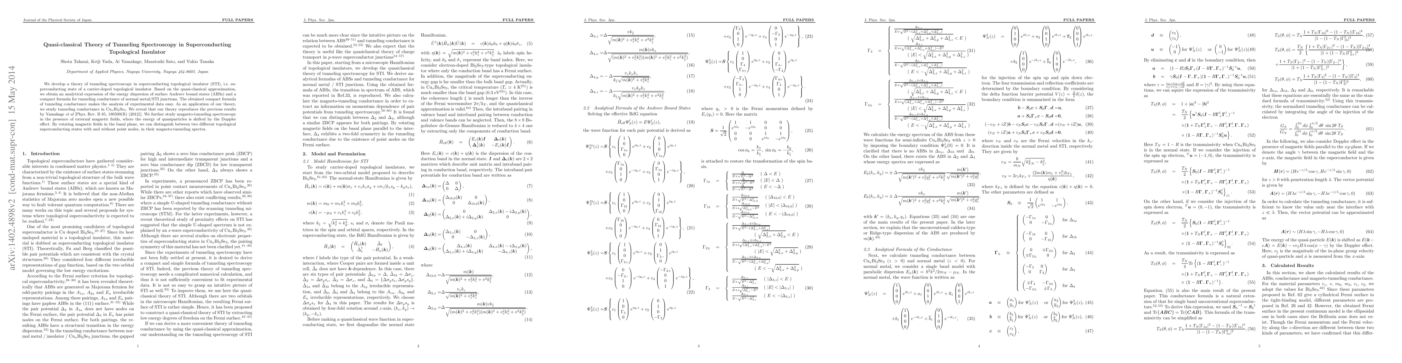 This paper develops a quasi-classical theory for tunneling spectroscopy in superconducting topological insulators, providing an analytical expression for surface Andreev bound states and a formula for tunneling conductance. The theory is applied to Cu$_x$Bi$_2$Se$_3$ and used to distinguish between different topological superconducting states via magneto-tunneling spectroscopy.