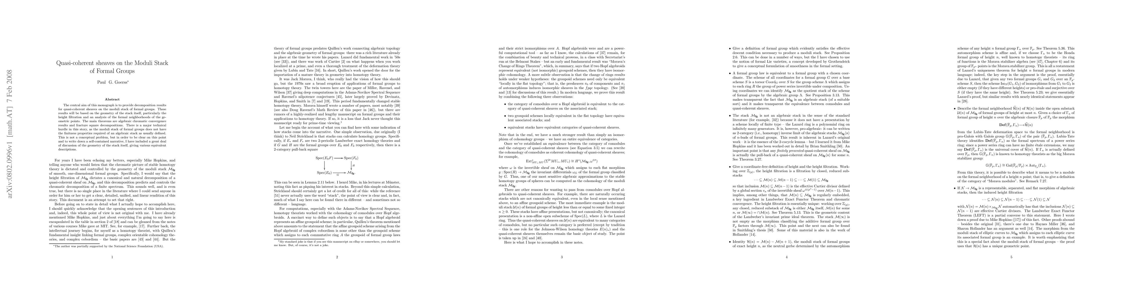 The central aim of this monograph is to provide decomposition results for quasi-coherent sheaves on the moduli stack of one-dimensional formal groups. These results will be based on the geometry of the stack itself, particularly the height filtration and an analysis of the formal neighborhoods of the geometric points. The main theorems are algebraic chromatic convergence results and fracture square decompositions. There is a major technical hurdle in this story, as the moduli stack of formal groups does not have the finitness properties required of an algebraic stack as usually defined. This is not a conceptual problem, but in order to be clear on this point and to write down a self-contained narrative, I have included a great deal of discussion of the geometry of the stack itself, giving various equivalent descriptions.