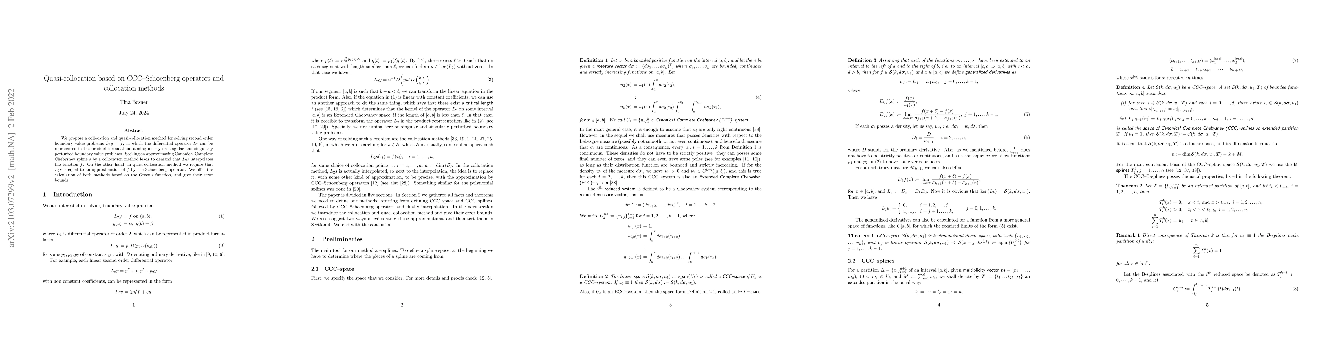 We propose a collocation and quasi-collocation method for solving second order boundary value problems $L_2 y=f$, in which the differential operator $L_2$ can be represented in the product formulation, aiming mostly on singular and singularly perturbed boundary value problems. Seeking an approximating Canonical Complete Chebyshev spline $s$ by a collocation method leads to demand that $L_2s$ interpolates the function $f$. On the other hand, in quasi-collocation method we require that $L_2 s$ is equal to an approximation of $f$ by the Schoenberg operator. We offer the calculation of both methods based on the Green's function, and give their error bounds.