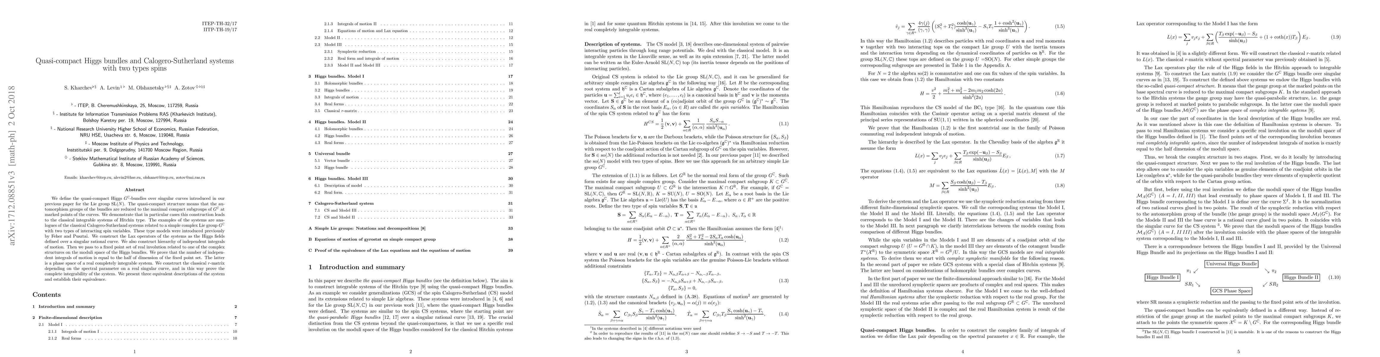 This paper defines quasi-compact Higgs bundles over singular curves, showing their relation to classical integrable systems of Hitchin type and Calogero-Sutherland models with two types of spin. It establishes complete integrability and constructs Lax operators and independent integrals of motion.