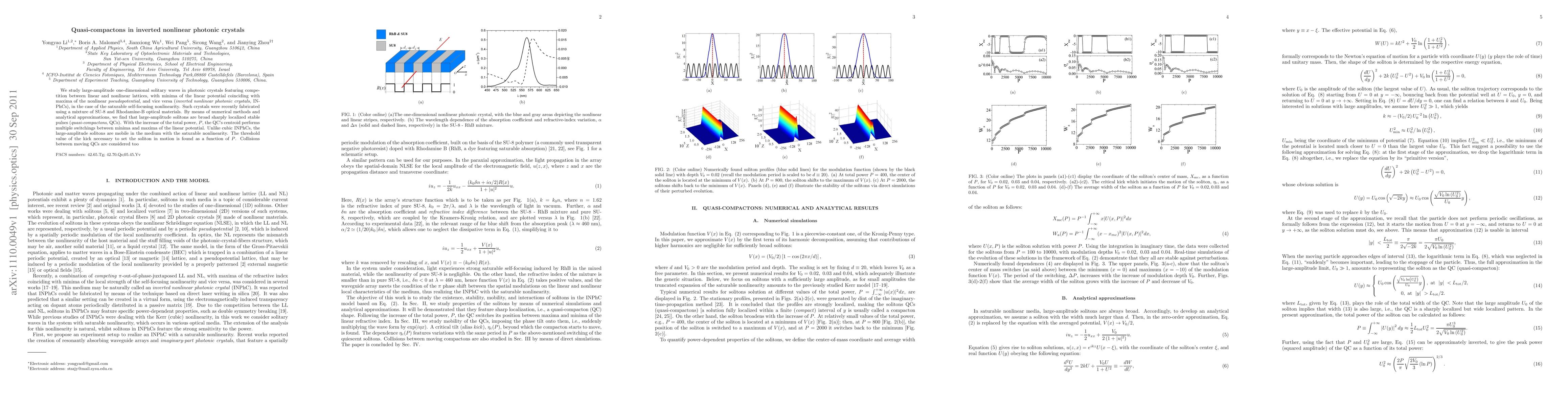 This paper investigates large-amplitude solitary waves in inverted nonlinear photonic crystals, finding that they form stable, broad pulses called quasi-compactons. These solitons exhibit dynamic behavior, including multiple switchings between potential minima and maxima with increasing power, and can be set in motion by a threshold kick.