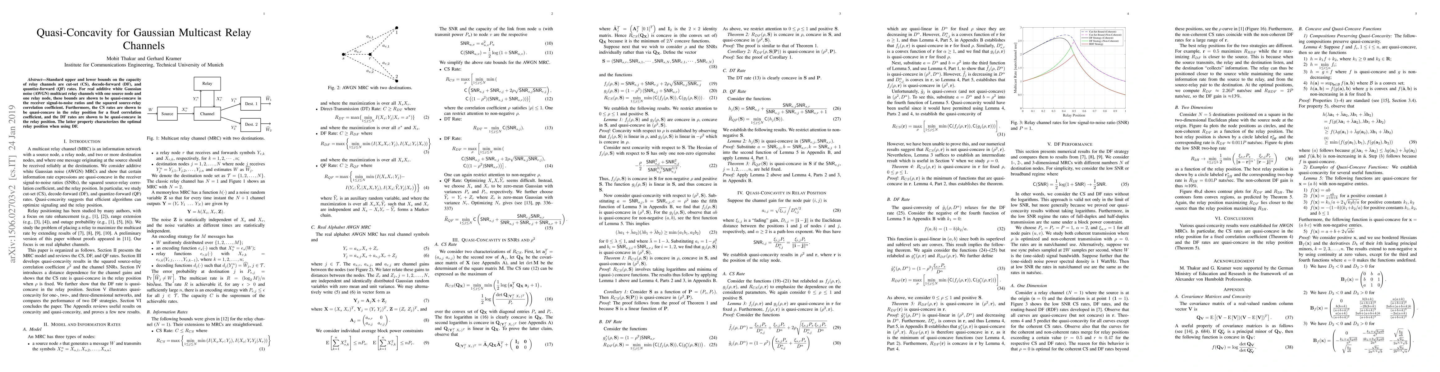 Standard upper and lower bounds on the capacity of relay channels are cut-set (CS), decode-forward (DF), and quantize-forward (QF) rates. For real additive white Gaussian noise (AWGN) multicast relay channels with one source node and one relay node, these bounds are shown to be quasi-concave in the receiver signal-to-noise ratios and the squared source-relay correlation coefficient. Furthermore, the CS rates are shown to be quasi-concave in the relay position for a fixed correlation coefficient, and the DF rates are shown to be quasi-concave in the relay position. The latter property characterizes the optimal relay position when using DF.