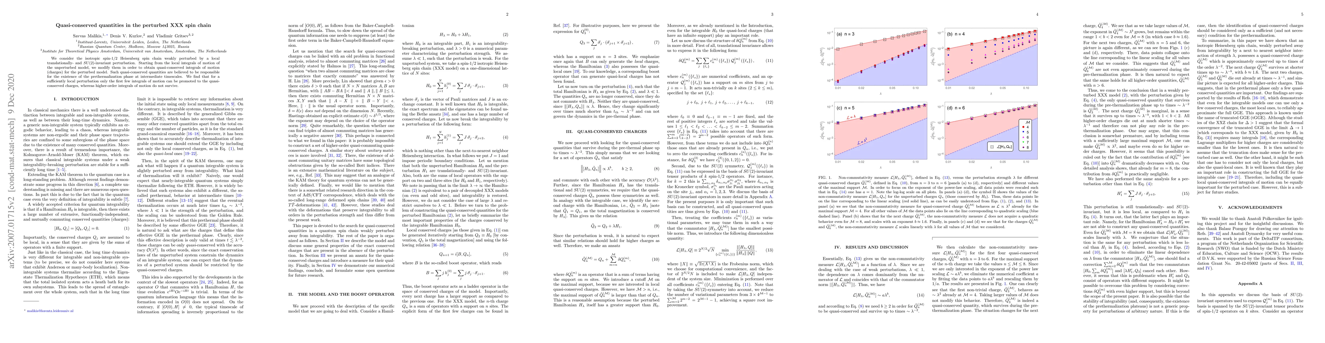 This paper investigates quasi-conserved quantities in a weakly perturbed isotropic spin-1/2 Heisenberg spin chain, modifying local integrals of motion to identify quasi-conserved charges responsible for prethermalization. It finds that only the first few integrals of motion remain quasi-conserved for sufficiently local perturbations.
