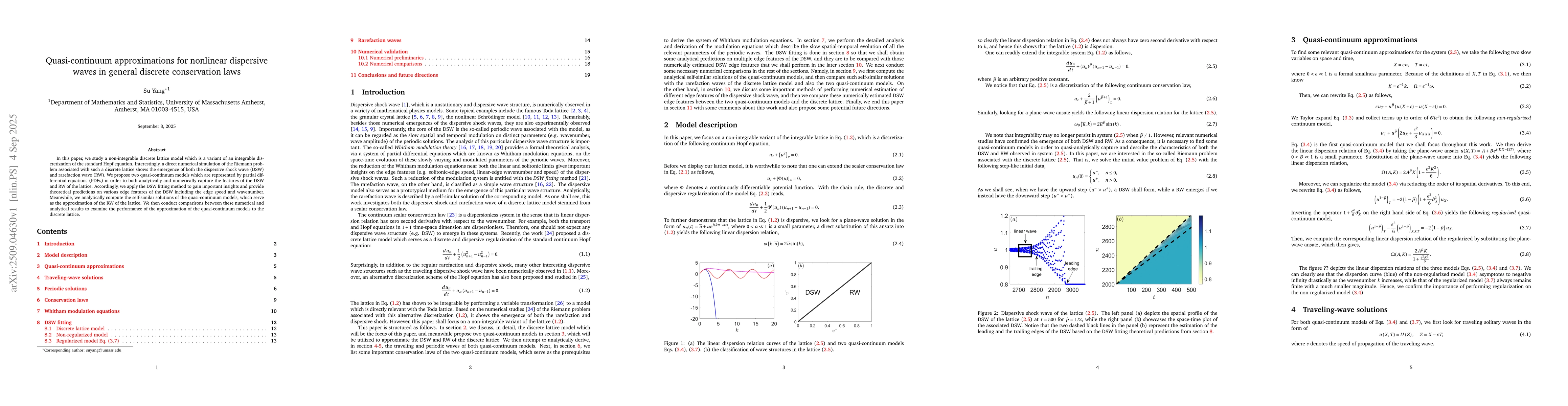 In this paper, we study a non-integrable discrete lattice model which is a variant of an integrable discretization of the standard Hopf equation. Interestingly, a direct numerical simulation of the Riemann problem associated with such a discrete lattice shows the emergence of both the dispersive shock wave (DSW) and rarefaction wave (RW). We propose two quasi-continuum models which are represented by partial differential equations (PDEs) in order to both analytically and numerically capture the features of the DSW and RW of the lattice. Accordingly, we apply the DSW fitting method to gain important insights and provide theoretical predictions on various edge features of the DSW including the edge speed and wavenumber. Meanwhile, we analytically compute the self-similar solutions of the quasi-continuum models, which serve as the approximation of the RW of the lattice. We then conduct comparisons between these numerical and analytical results to examine the performance of the approximation of the quasi-continuum models to the discrete lattice.