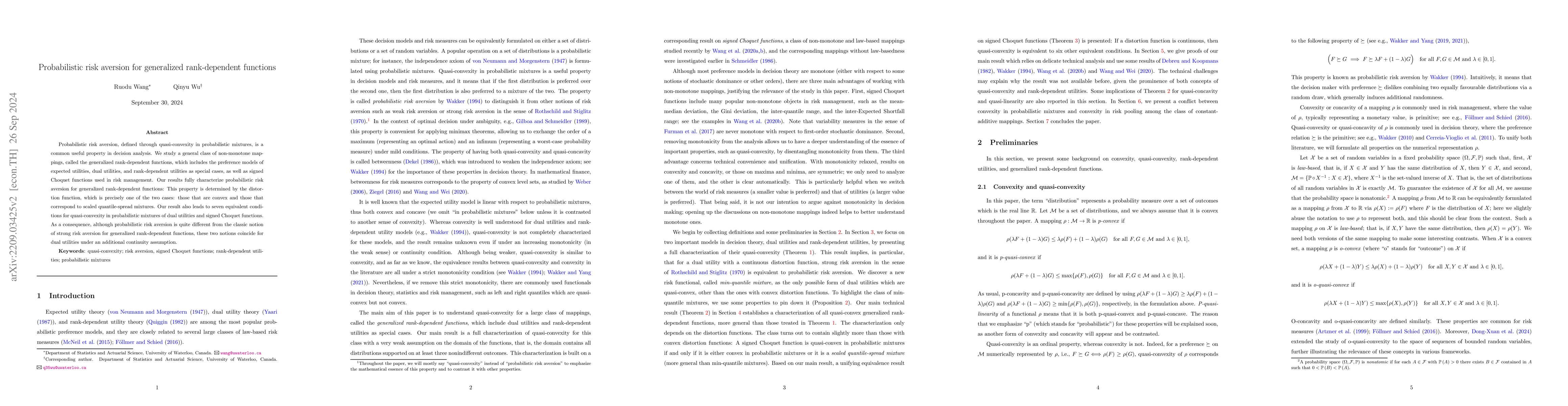 This paper investigates the quasi-convexity property in probabilistic mixtures for generalized rank-dependent functions, including expected utilities, dual utilities, and rank-dependent utilities. It characterizes quasi-convex signed Choquet integrals and provides seven equivalent conditions for quasi-convexity in mixtures for dual utilities and signed Choquet integrals.