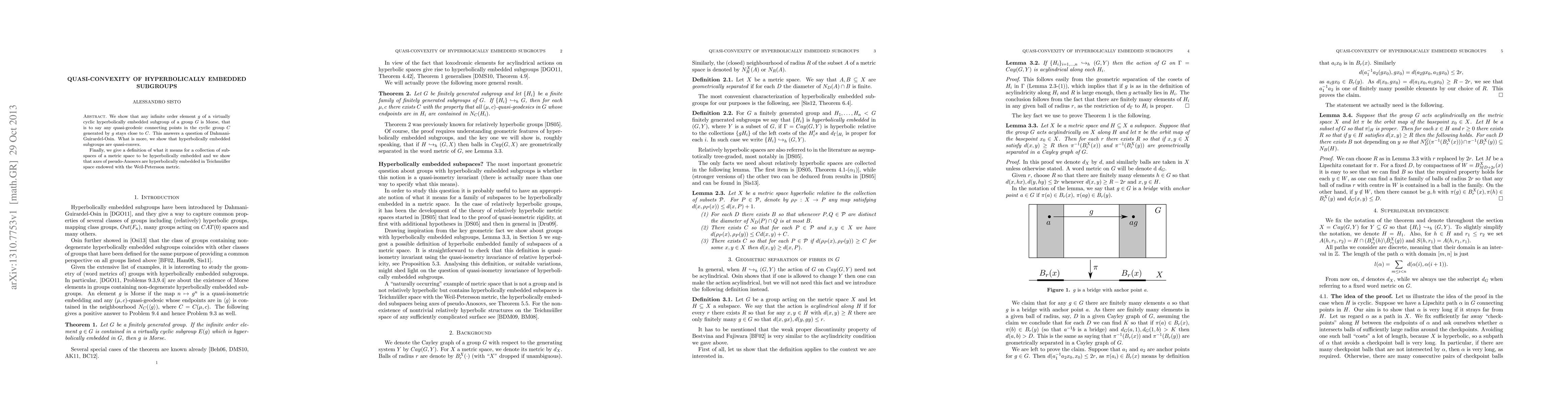 The paper demonstrates that any infinite order element in a virtually cyclic hyperbolically embedded subgroup of a group $G$ is Morse, confirming a question posed by Dahmani-Guirardel-Osin. Additionally, it proves that hyperbolically embedded subgroups are quasi-convex and explores the hyperbolic embedding of axes of pseudo-Anosovs in Teichmüller space.
