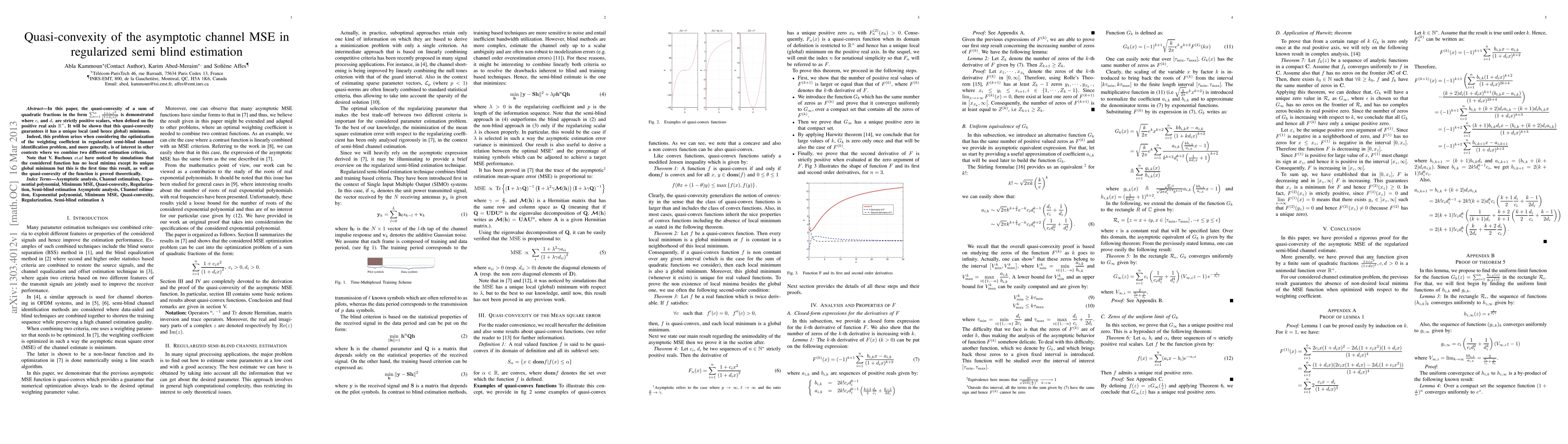 In this paper, the quasi-convexity of a sum of quadratic fractions in the form $\sum_{i=1}^n \frac{1+c_i x^2}{\left(1+d_ix\right)^2}$ is demonstrated where $c_i$ and $d_i$ are strictly positive scalars, when defined on the positive real axis $\mathbb{R}^{+}$. It will be shown that this quasi-convexity guarantees it has a unique local (and hence global) minimum. Indeed, this problem arises when considering the optimization of the weighting coefficient in regularized semi-blind channel identification problem, and more generally, is of interest in other contexts where we combine two different estimation criteria. Note that V. Buchoux {\it et.al} have noticed by simulations that the considered function has no local minima except its unique global minimum but this is the first time this result, as well as the quasi-convexity of the function is proved theoretically.