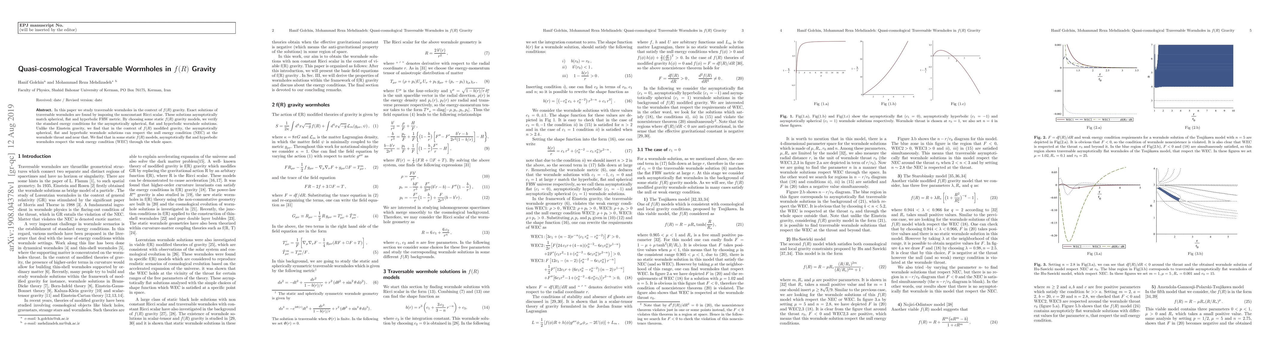 This paper investigates traversable wormholes in $f(R)$ gravity, finding exact solutions that match spherical, flat, and hyperbolic FRW metrics. It reveals that in $f(R)$ gravity, unlike Einstein gravity, wormholes can satisfy the null energy condition at the throat, and some models respect the weak energy condition throughout the space.
