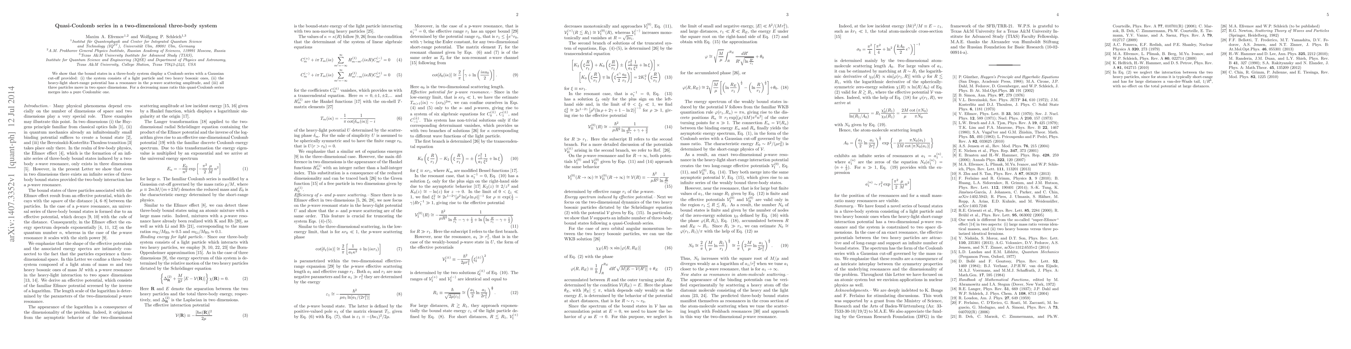 We show that the bound states in a three-body system display a Coulomb series with a Gaussian cut-off provided: (i) the system consists of a light particle and two heavy bosonic ones, (ii) the heavy-light short-range potential has a resonance in the $p$-wave scattering amplitude, and (iii) all three particles move in two space dimensions. For a decreasing mass ratio this quasi-Coulomb series merges into a pure Coulombic one.