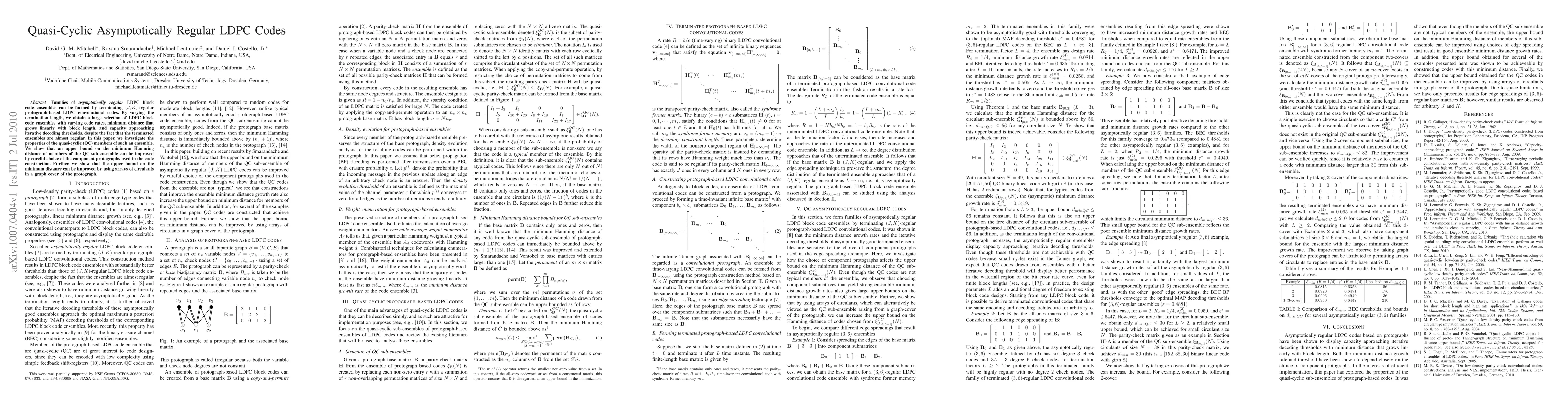 This paper explores quasi-cyclic (QC) members within asymptotically regular LDPC code ensembles, demonstrating that selecting appropriate protographs and using arrays of circulants can enhance the minimum Hamming distance, approaching capacity thresholds despite near-regularity.