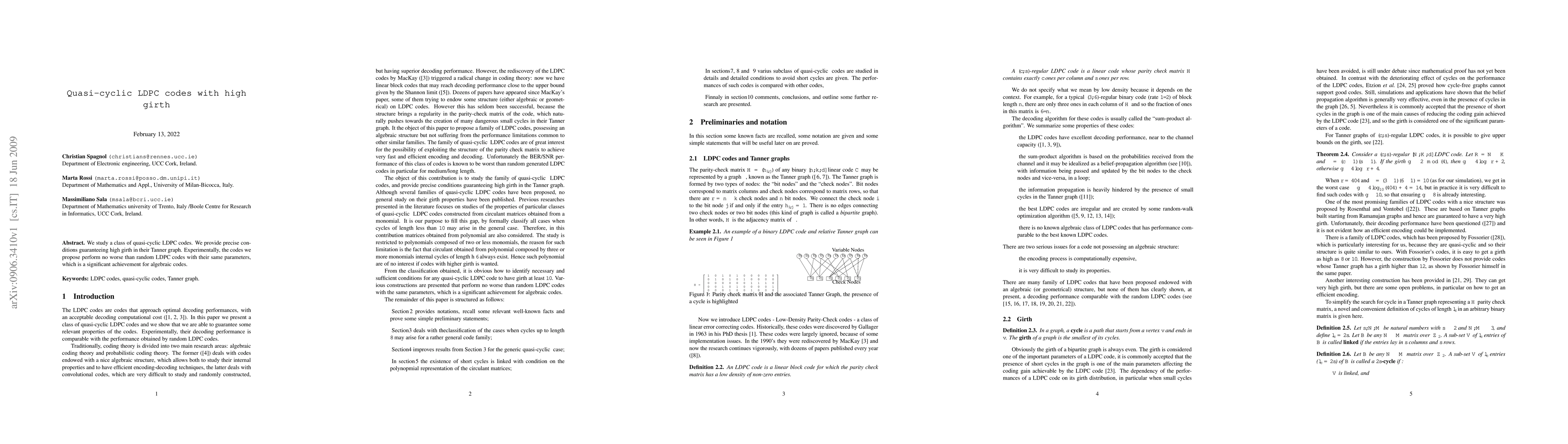 We study a class of quasi-cyclic LDPC codes. We provide precise conditions guaranteeing high girth in their Tanner graph. Experimentally, the codes we propose perform no worse than random LDPC codes with their same parameters, which is a significant achievement for algebraic codes.