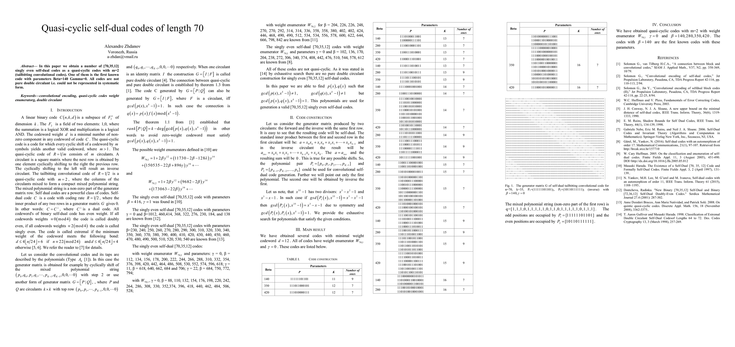 In this paper we obtain a number of [70,35,12] singly even self-dual codes as a quasi-cyclic codes with m=2 (tailbitting convolutional codes). One of them is the first known code with parameters Beta=140 Gamma=0. All codes are not pure double circulant i.e. could not be represented in systematic form.