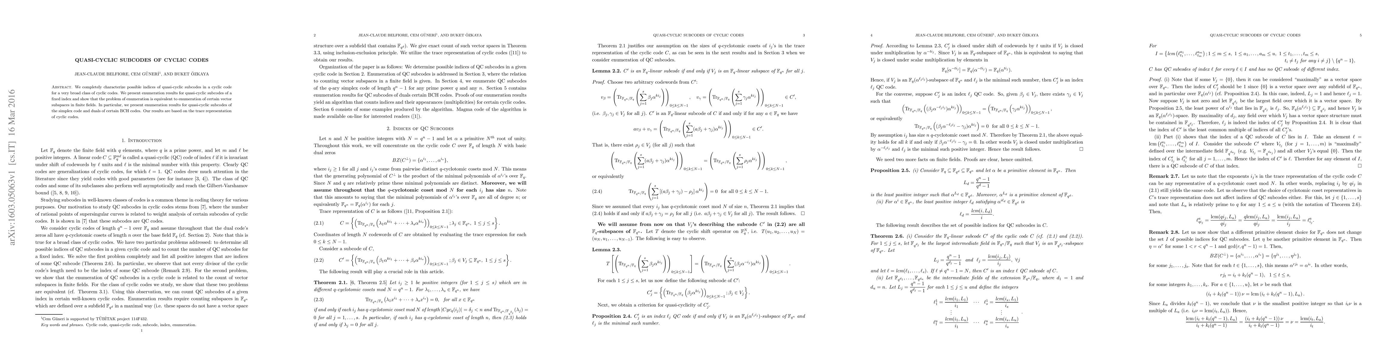 The paper characterizes indices of quasi-cyclic subcodes in a broad class of cyclic codes using trace representation, providing enumeration results for specific codes like the simplex code and duals of certain BCH codes.