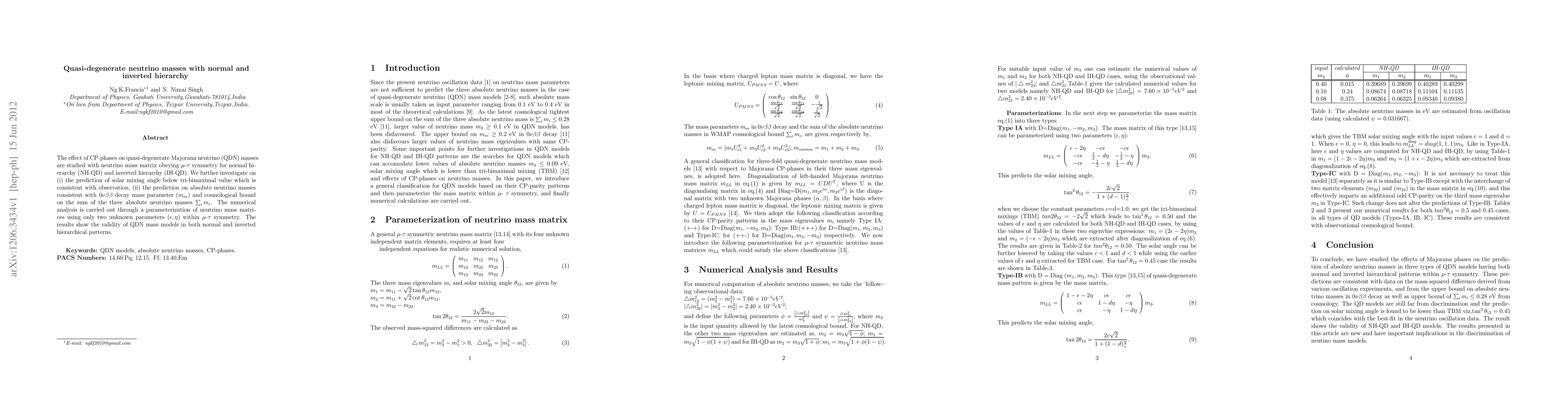 This paper investigates the effects of CP-phases on quasi-degenerate Majorana neutrino masses under μ-τ symmetry, predicting solar mixing angle values, absolute neutrino mass parameters, and cosmological mass bounds for both normal and inverted hierarchies. The study finds these models remain valid and not yet ruled out.