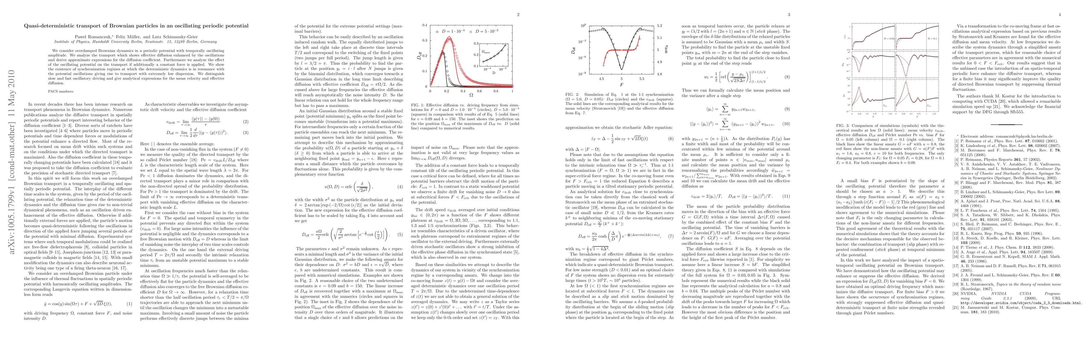 This paper investigates the quasi-deterministic transport of Brownian particles in an oscillating periodic potential, deriving expressions for enhanced diffusion and mean velocity under both constant force and resonance conditions. It highlights synchronization regimes with minimal dispersion in transport due to resonance with potential oscillations.