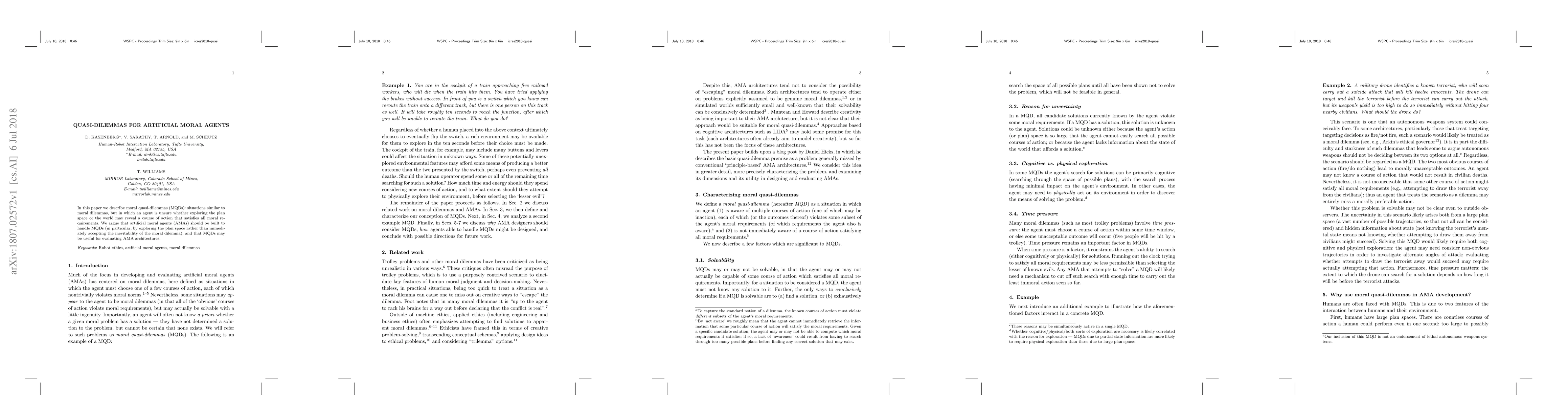 In this paper we describe moral quasi-dilemmas (MQDs): situations similar to moral dilemmas, but in which an agent is unsure whether exploring the plan space or the world may reveal a course of action that satisfies all moral requirements. We argue that artificial moral agents (AMAs) should be built to handle MQDs (in particular, by exploring the plan space rather than immediately accepting the inevitability of the moral dilemma), and that MQDs may be useful for evaluating AMA architectures.