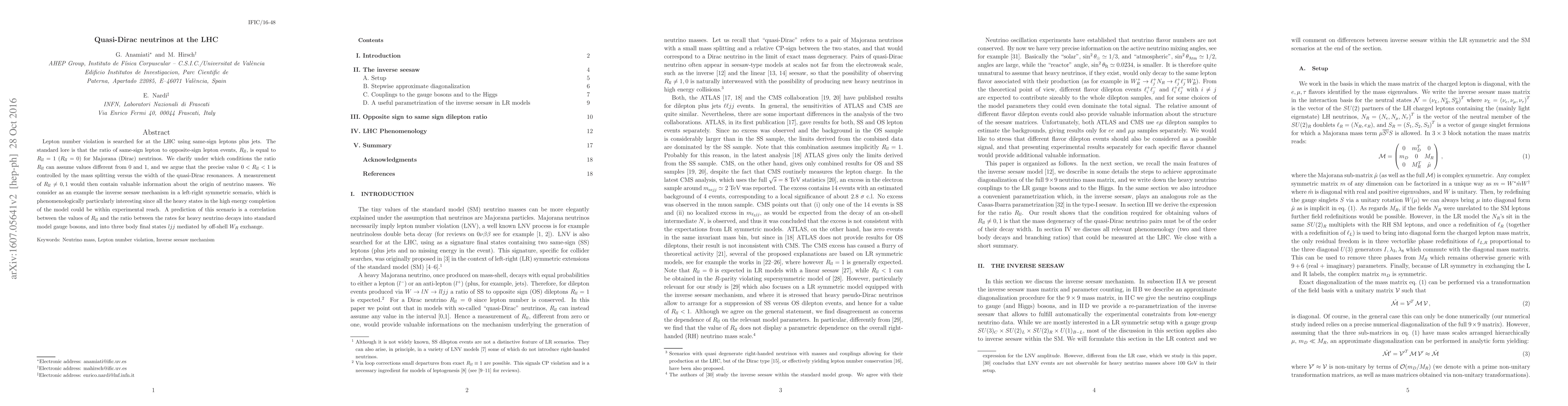 Lepton number violation is searched for at the LHC using same-sign leptons plus jets. The standard lore is that the ratio of same-sign lepton to opposite-sign lepton events, $R_{ll}$, is equal to $R_{ll}=1$ ($R_{ll}=0$) for Majorana (Dirac) neutrinos. We argue that for "quasi-Dirac" neutrinos, $R_{ll}$ can have any value between 0 and 1, the precise value being controlled by the mass splitting versus the width of the quasi-Dirac resonances. A measurement of $R_{ll}\neq 0,1$ would then contain valuable information about the origin of neutrino masses. We consider as an example the inverse seesaw mechanism in a left-right symmetric scenario, which is phenomenologically particularly interesting since all the heavy states in the high energy completion of the model could be within experimental reach. A prediction of this scenario is a correlation between the values of $R_{ll}$ and the ratio between the rates for heavy neutrino decays into standard model gauge bosons, and into three body final states $ljj$ mediated by off-shell $W_R$ exchange.