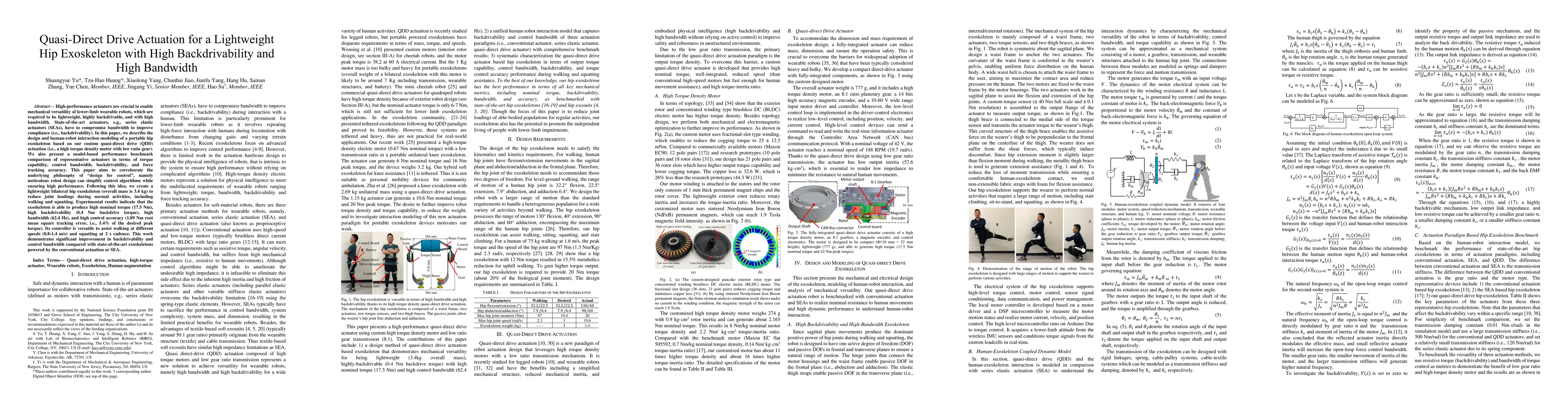 High-performance actuators are crucial to enable mechanical versatility of lower-limb wearable robots, which are required to be lightweight, highly backdrivable, and with high bandwidth. State-of-the-art actuators, e.g., series elastic actuators (SEAs), have to compromise bandwidth to improve compliance (i.e., backdrivability). In this paper, we describe the design and human-robot interaction modeling of a portable hip exoskeleton based on our custom quasi-direct drive (QDD) actuation (i.e., a high torque density motor with low ratio gear). We also present a model-based performance benchmark comparison of representative actuators in terms of torque capability, control bandwidth, backdrivability, and force tracking accuracy. This paper aims to corroborate the underlying philosophy of "design for control", namely meticulous robot design can simplify control algorithms while ensuring high performance. Following this idea, we create a lightweight bilateral hip exoskeleton (overall mass is 3.4 kg) to reduce joint loadings during normal activities, including walking and squatting. Experimental results indicate that the exoskeleton is able to produce high nominal torque (17.5 Nm), high backdrivability (0.4 Nm backdrive torque), high bandwidth (62.4 Hz), and high control accuracy (1.09 Nm root mean square tracking error, i.e., 5.4% of the desired peak torque). Its controller is versatile to assist walking at different speeds (0.8-1.4 m/s) and squatting at 2 s cadence. This work demonstrates significant improvement in backdrivability and control bandwidth compared with state-of-the-art exoskeletons powered by the conventional actuation or SEA.