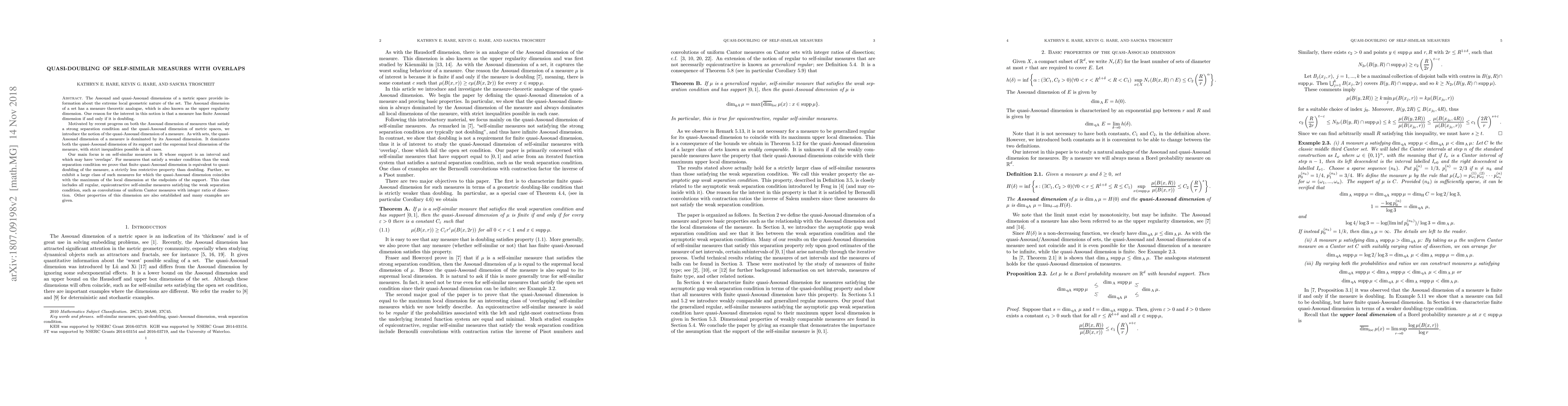 This paper introduces the quasi-Assouad dimension for self-similar measures in $\mathbb{R}$ with overlapping support, proving that finite quasi-Assouad dimension is equivalent to quasi-doubling, a less restrictive property than doubling. It also shows that for a large class of such measures, the quasi-Assouad dimension equals the maximum local dimension at the endpoints.