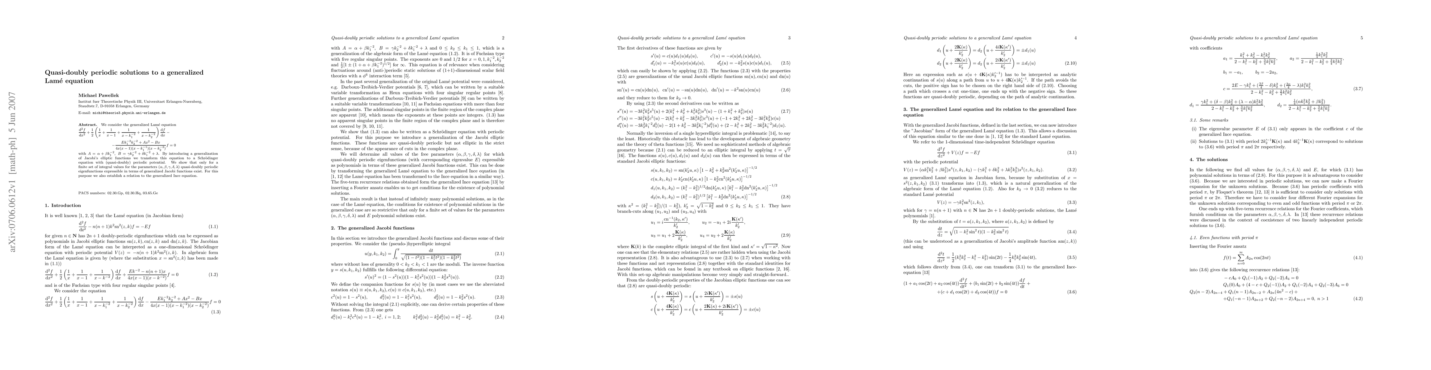 This paper explores a generalized Lame equation with five parameters, transforming it into a 1-dimensional time-independent Schrödinger equation with a quasi-doubly periodic potential. It demonstrates that only for specific integral values of the parameters do quasi-doubly periodic eigenfunctions, expressible in terms of generalized Jacobi functions, exist.