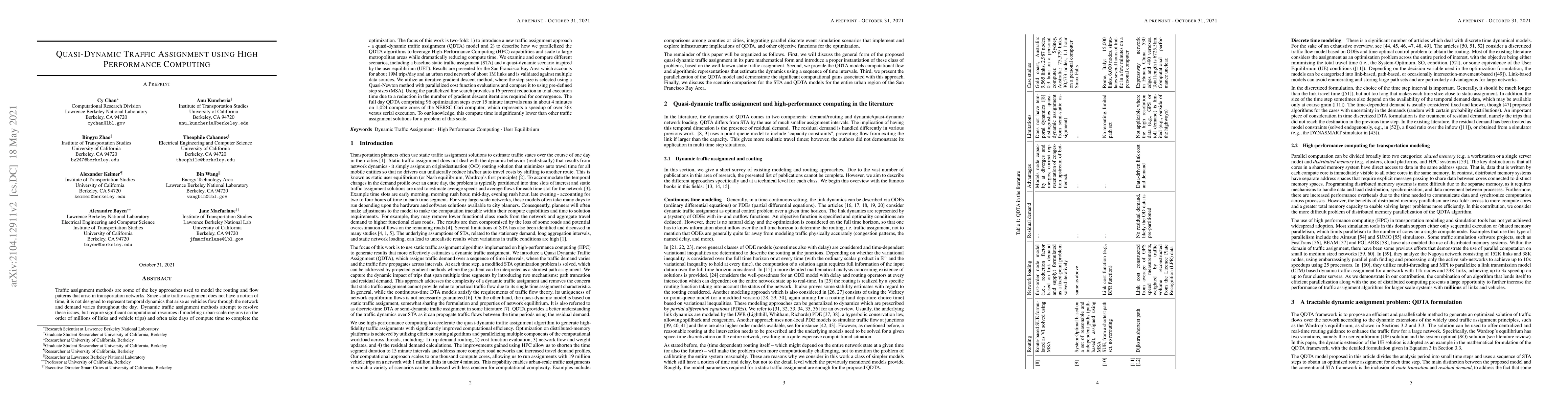 Traffic assignment methods are some of the key approaches used to model flow patterns that arise in transportation networks. Since static traffic assignment does not have a notion of time, it is not designed to represent temporal dynamics that arise as vehicles flow through the network and demand varies through the day. Dynamic traffic assignment methods attempt to resolve these issues, but require significant computational resources if modeling urban-scale regions (on the order of millions of links and vehicles) and often take days of compute time to complete. The focus of this work is two-fold: 1) to introduce a new traffic assignment approach - a quasi-dynamic traffic assignment (QDTA) model and 2) to describe how we parallelized the QDTA algorithms to leverage High-Performance Computing (HPC) and scale to large metropolitan areas while dramatically reducing compute time. We examine and compare different scenarios, including a baseline static traffic assignment (STA) and a quasi-dynamic scenario inspired by the user-equilibrium (UET). Results are presented for the San Francisco Bay Area which accounts for 19M trips/day and an urban road network of 1M links. We utilize an iterative gradient descent method, where the step size is selected using a Quasi-Newton method with parallelized cost function evaluations and compare it to using pre-defined step sizes (MSA). Using the parallelized line search provides a 16 percent reduction in total execution time due to a reduction in the number of gradient descent iterations required for convergence. The full day QDTA comprising 96 optimization steps over 15 minute intervals runs in about 4 minutes on 1,024 cores of the NERSC Cori computer, which represents a speedup of over 36x versus serial execution. To our knowledge, this compute time is significantly lower than other traffic assignment solutions for a problem of this scale.