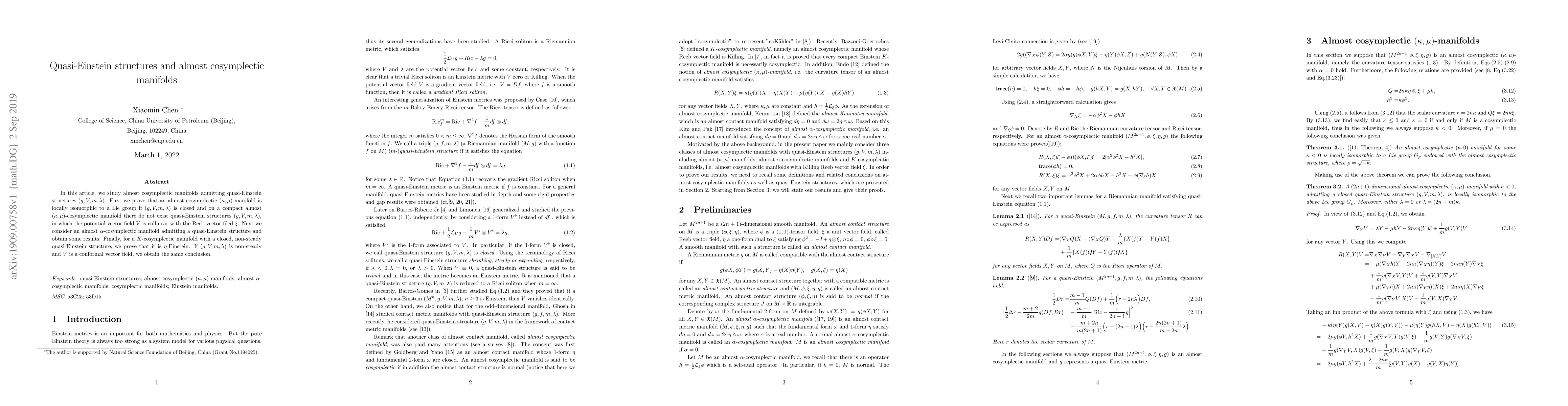 This paper explores almost cosymplectic manifolds with quasi-Einstein structures, proving that certain conditions lead to local isomorphism to Lie groups and that specific configurations on compact manifolds are impossible. It also demonstrates that under certain quasi-Einstein conditions, a $K$-cosymplectic manifold becomes $\eta$-Einstein.