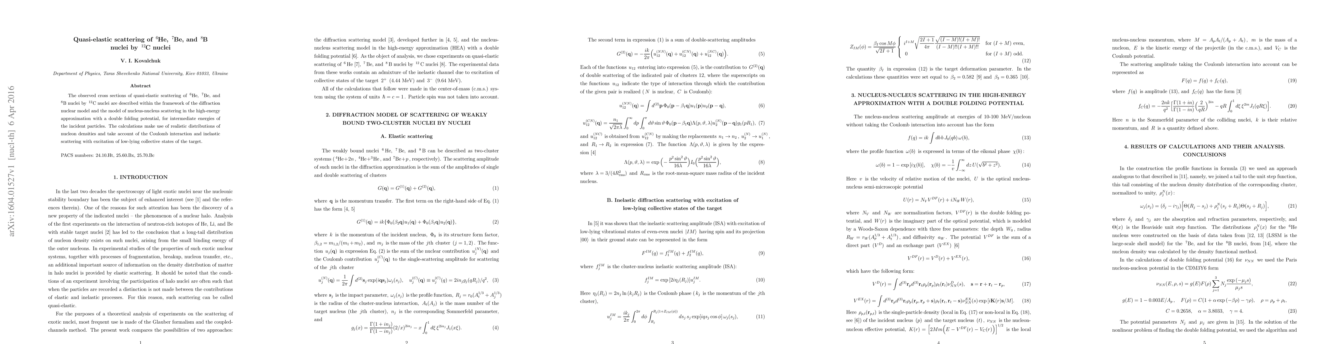 This study investigates the quasi-elastic scattering of 6He, 7Be, and 8B nuclei by 12C using the diffraction nuclear model and high-energy approximation, with calculations incorporating realistic nucleon densities and accounting for Coulomb interaction and inelastic scattering.