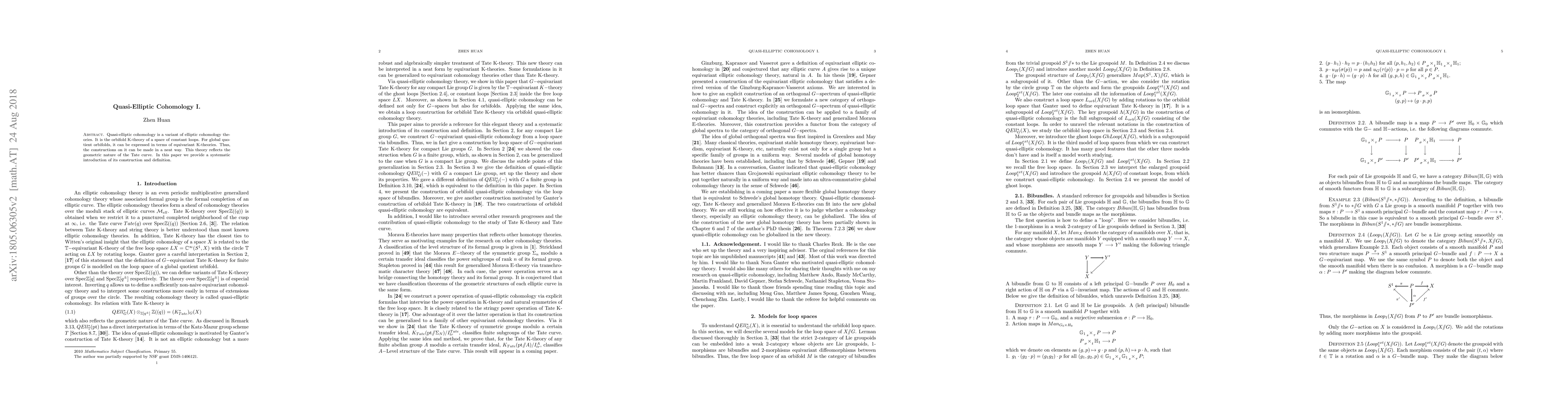 This paper systematically introduces quasi-elliptic cohomology, a variant of elliptic cohomology theories, as the orbifold K-theory of constant loops, with a focus on its construction and definition, especially for global quotient orbifolds where it relates to equivariant K-theories. The theory mirrors the geometric nature of the Tate curve.
