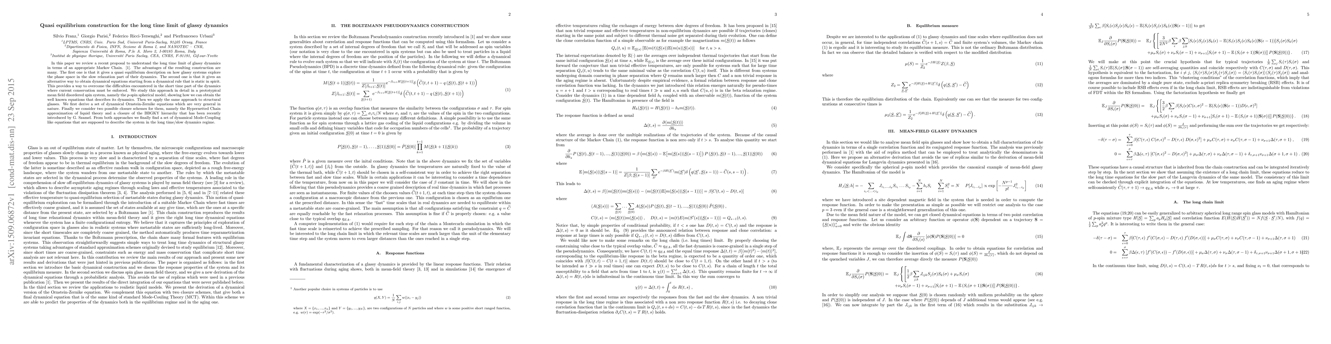 In this paper we review a recent proposal to understand the long time limit of glassy dynamics in terms of an appropriate Markov Chain. [1]. The advantages of the resulting construction are many. The first one is that it gives a quasi equilibrium description on how glassy systems explore the phase space in the slow relaxation part of their dynamics. The second one is that it gives an alternative way to obtain dynamical equations starting from a dynamical rule that is static in spirit. This provides a way to overcome the difficulties encountered in the short time part of the dynamics where current conservation must be enforced. We study this approach in detail in a prototypical mean field disordered spin system, namely the p-spin spherical model, showing how we can obtain the well known equations that describes its dynamics. Then we apply the same approach to structural glasses. We first derive a set of dynamical Ornstein-Zernike equations which are very general in nature. Finally we consider two possible closure schemes for them, namely the Hypernetted Chain approximation of liquid theory and a closure of the BBGKY hierarchy that has been recently introduced by G. Szamel. From both approaches we finally find a set of dynamical Mode-Coupling like equations that are supposed to describe the system in the long time/slow dynamics regime.