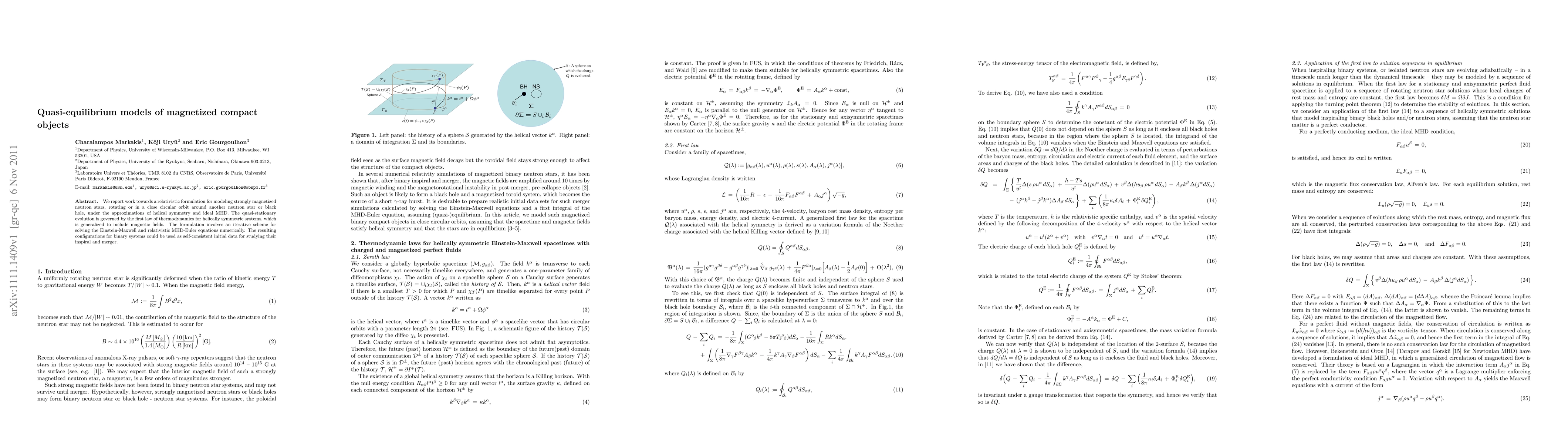 The paper introduces a relativistic formulation and numerical scheme for modeling magnetized compact objects under helical symmetry and ideal MHD, extending previous work to include magnetic fields in the first law of thermodynamics.