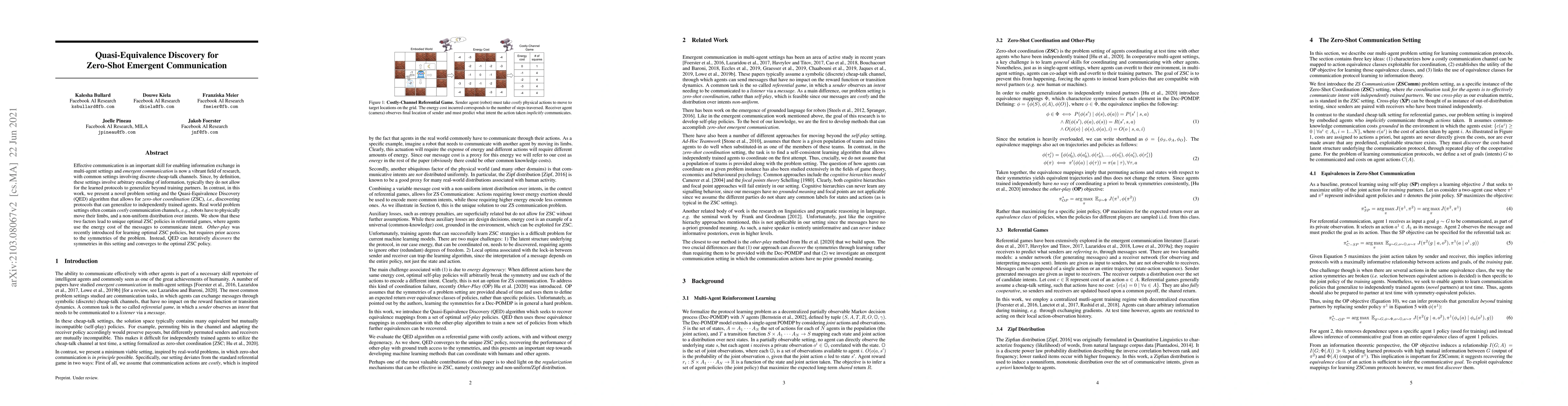 This paper introduces the Quasi-Equivalence Discovery (QED) algorithm for zero-shot emergent communication in multi-agent systems, enabling protocols that generalize to independently trained agents. Unlike previous methods, QED iteratively discovers problem symmetries and optimizes communication strategies under costly channels and non-uniform intent distributions.