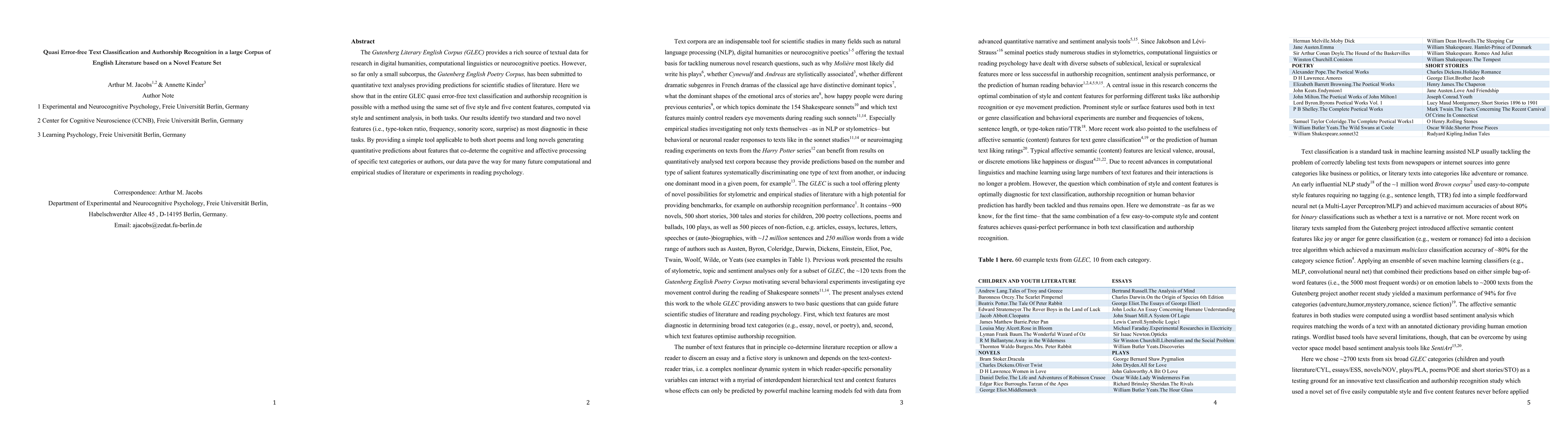 The Gutenberg Literary English Corpus (GLEC) provides a rich source of textual data for research in digital humanities, computational linguistics or neurocognitive poetics. However, so far only a small subcorpus, the Gutenberg English Poetry Corpus, has been submitted to quantitative text analyses providing predictions for scientific studies of literature. Here we show that in the entire GLEC quasi error-free text classification and authorship recognition is possible with a method using the same set of five style and five content features, computed via style and sentiment analysis, in both tasks. Our results identify two standard and two novel features (i.e., type-token ratio, frequency, sonority score, surprise) as most diagnostic in these tasks. By providing a simple tool applicable to both short poems and long novels generating quantitative predictions about features that co-determe the cognitive and affective processing of specific text categories or authors, our data pave the way for many future computational and empirical studies of literature or experiments in reading psychology.