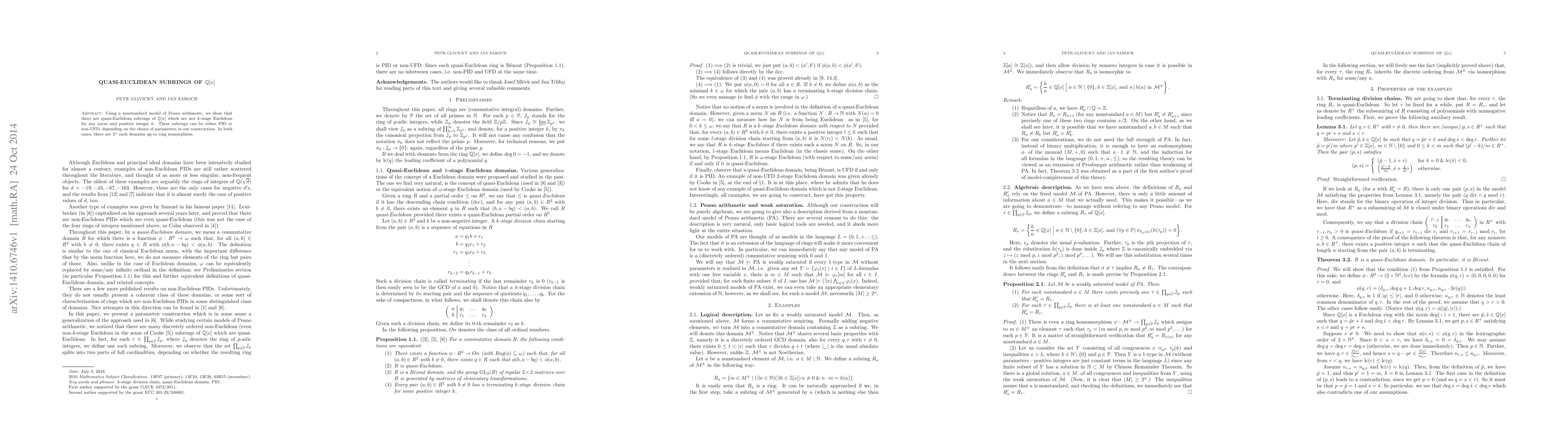 This paper demonstrates the existence of quasi-Euclidean subrings of Q[x] using a nonstandard model of Peano arithmetic, showing they are not k-stage Euclidean for any norm and positive integer k. These subrings can be either principal ideal domains or non-unique factorization domains, with 2^ω such domains up to ring isomorphism.