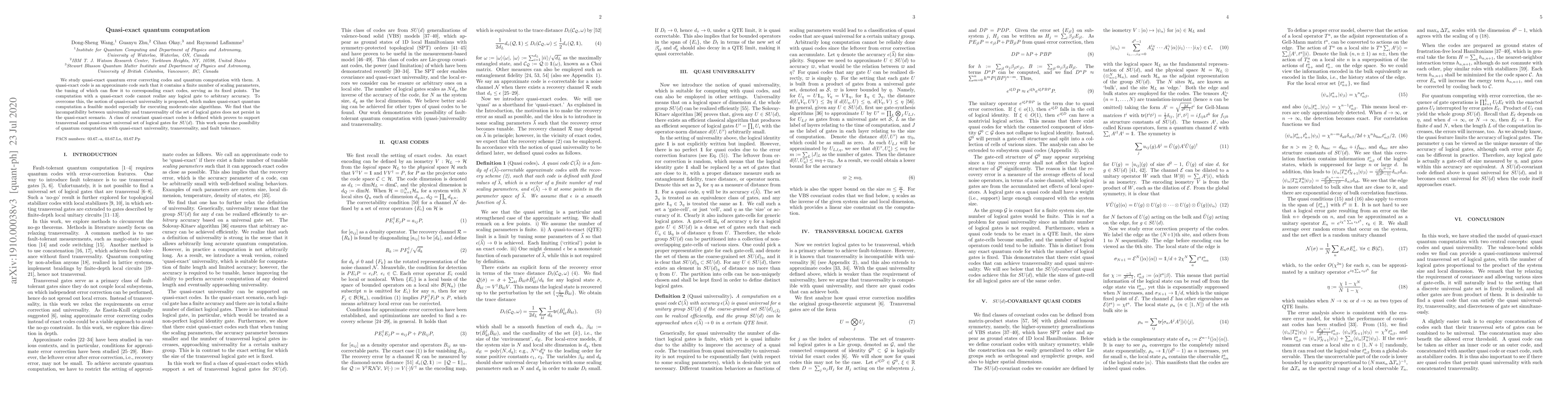 We study quasi-exact quantum error correcting codes and quantum computation with them. A quasi-exact code is an approximate code such that it contains a finite number of scaling parameters, the tuning of which can flow it to corresponding exact codes, serving as its fixed points. The computation with a quasi-exact code cannot realize any logical gate to arbitrary accuracy. To overcome this, the notion of quasi-exact universality is proposed, which makes quasi-exact quantum computation a feasible model especially for executing moderate-size algorithms. We find that the incompatibility between universality and transversality of the set of logical gates does not persist in the quasi-exact scenario. A class of covariant quasi-exact codes is defined which proves to support transversal and quasi-exact universal set of logical gates for $SU(d)$. This work opens the possibility of quantum computation with quasi-exact universality, transversality, and fault tolerance.